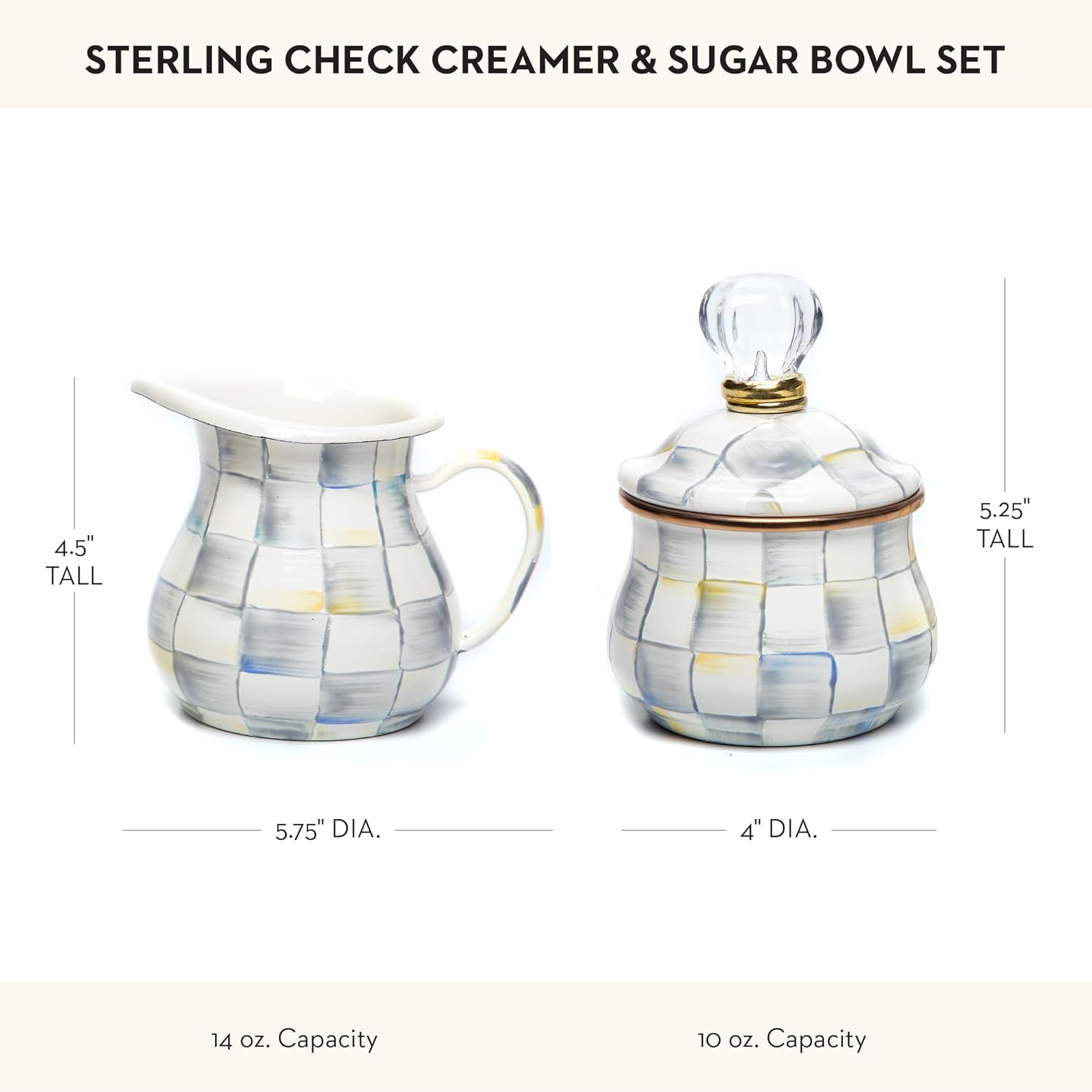 MACKENZIE-CHILDS Enamel Creamer and Sugar-Bowl Set, Cream Dispenser and Sugar Holder, Unique Kitchen Decor, Gray-and-White Sterling Check