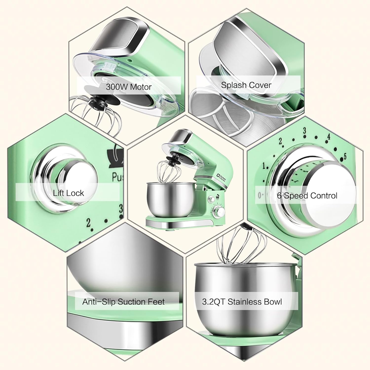 Kitchen in the box Stand Mixer,3.2Qt Mini Electric Food Mixer,6 Speeds Portable Lightweight Kitchen Mixer for Daily Use with Egg Whisk,Dough Hook,Flat Beater (Green)
