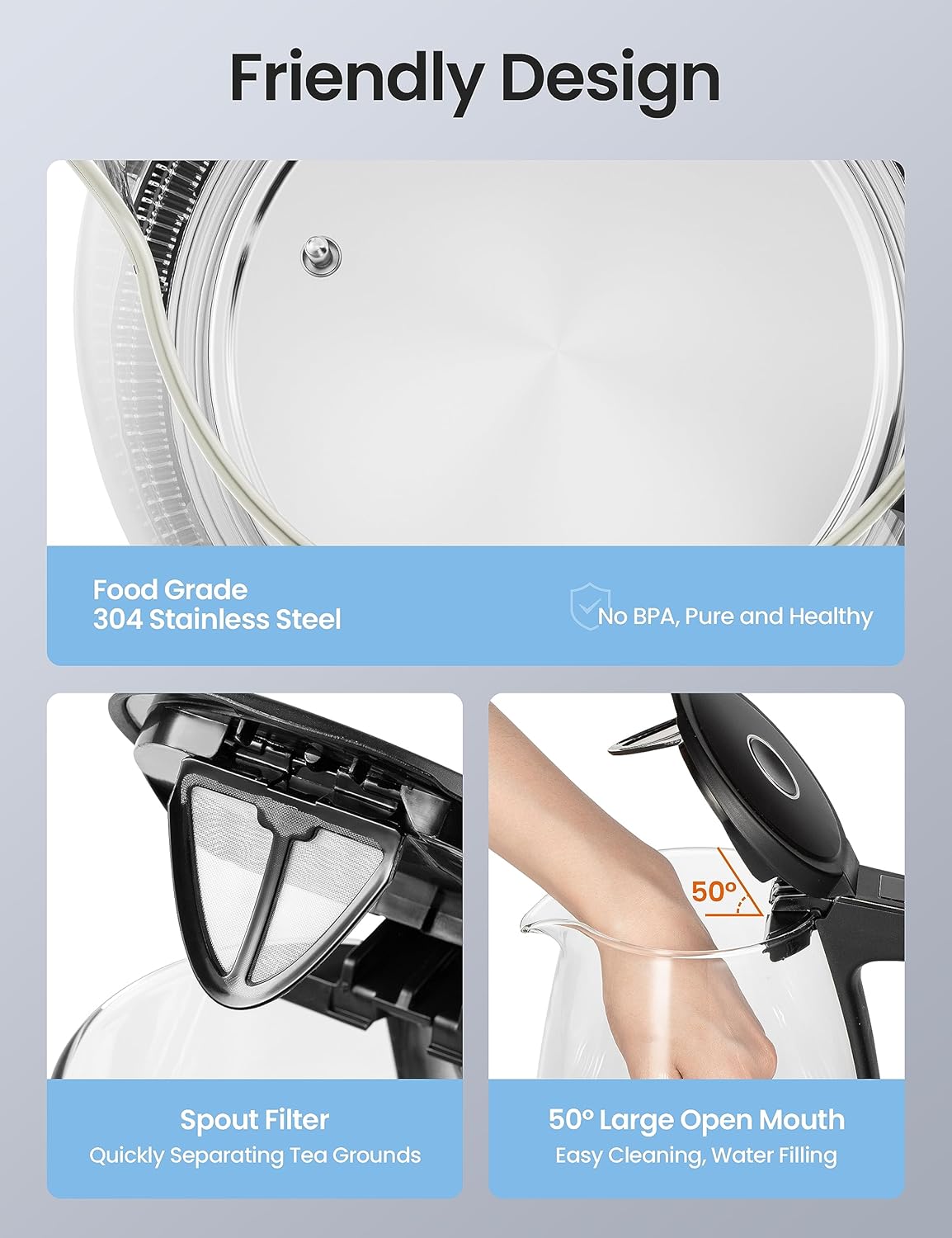 - Easy to Fill & Clean: The wide mouth and non-removable 50° lid make filling and cleaning the glass kettle a breeze. The teapot electric kettle has convenient measurement scale marks to help you boil the perfect amount of water. Hand wash regularly with baking soda or lemon to keep your clear tea kettle clean.