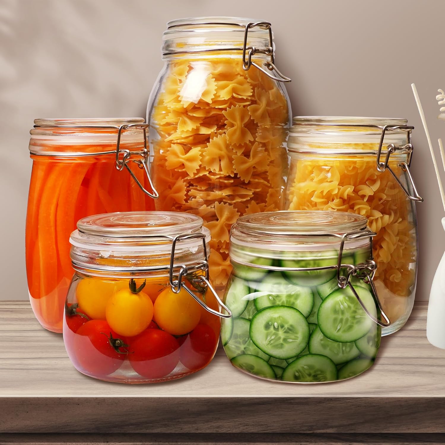 - [ Versatile Glass Jars with Airtight Lid Set of 6 ]: 6 small glass storage jars in one set, measuring 4.53 x 3.94 inch [about 17 floz], great for storing dry foods like coffee,sugar,spice,snacks, keeping them dry and fresh.Equipped with Air tight clamp lids, creating an airtight seal to extend the shelf life, and ideal for crafting pickles,fermenting sauerkraut and canning a variety of jams and preserves.Elevate your food storage and preservation with this versatile glass storage jars wit lids
