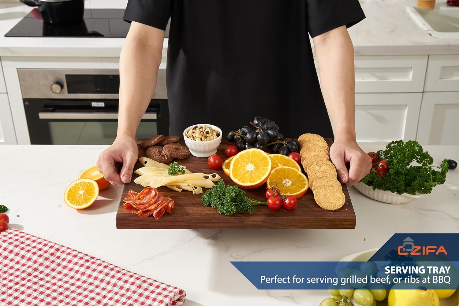 - [REVERSIBLE, MULTIPURPOSE]: This large, smooth wood cutting board boasts a front side with a juice groove design, seamlessly catching liquids while you cut, chop, and dice. Its spacious surface caters to all your culinary needs. Built-in handles ensure comfortable carrying and maneuvering. The back side offers a flat, versatile space for prepping ingredients, serving grilled meats, displaying cheese platters, or acting as a kitchen mat. Perfect for BBQs, parties, or everyday cooking. An housewarming gift with practicality and style.