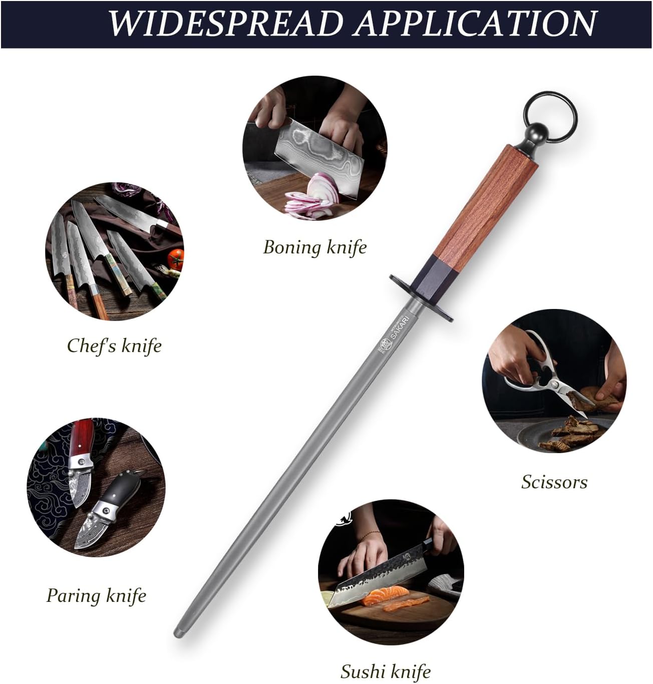 MITSUMOTO SAKARI 12 Inch Round Honing Rod, Japanese High Carbon Honing Steel (Sourwood Handle)
