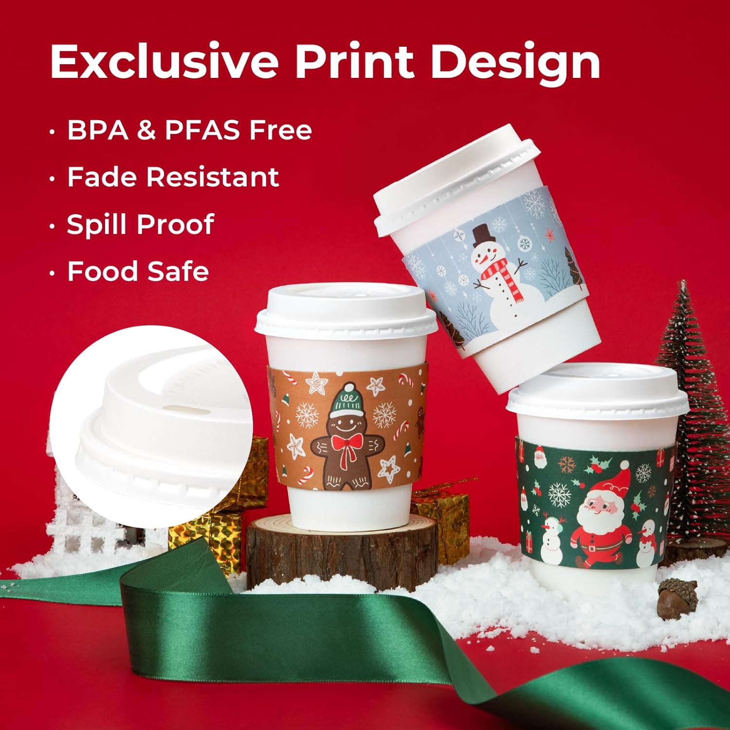 - Ideal Christmas Hot Cups with Lids: The tightly sealing lid prevents leaks and spills while keeping beverages warm. Each festive disposable cup features a rolled rim for comfortable, leak-free sipping, and a poly-coated lining to minimize condensation.