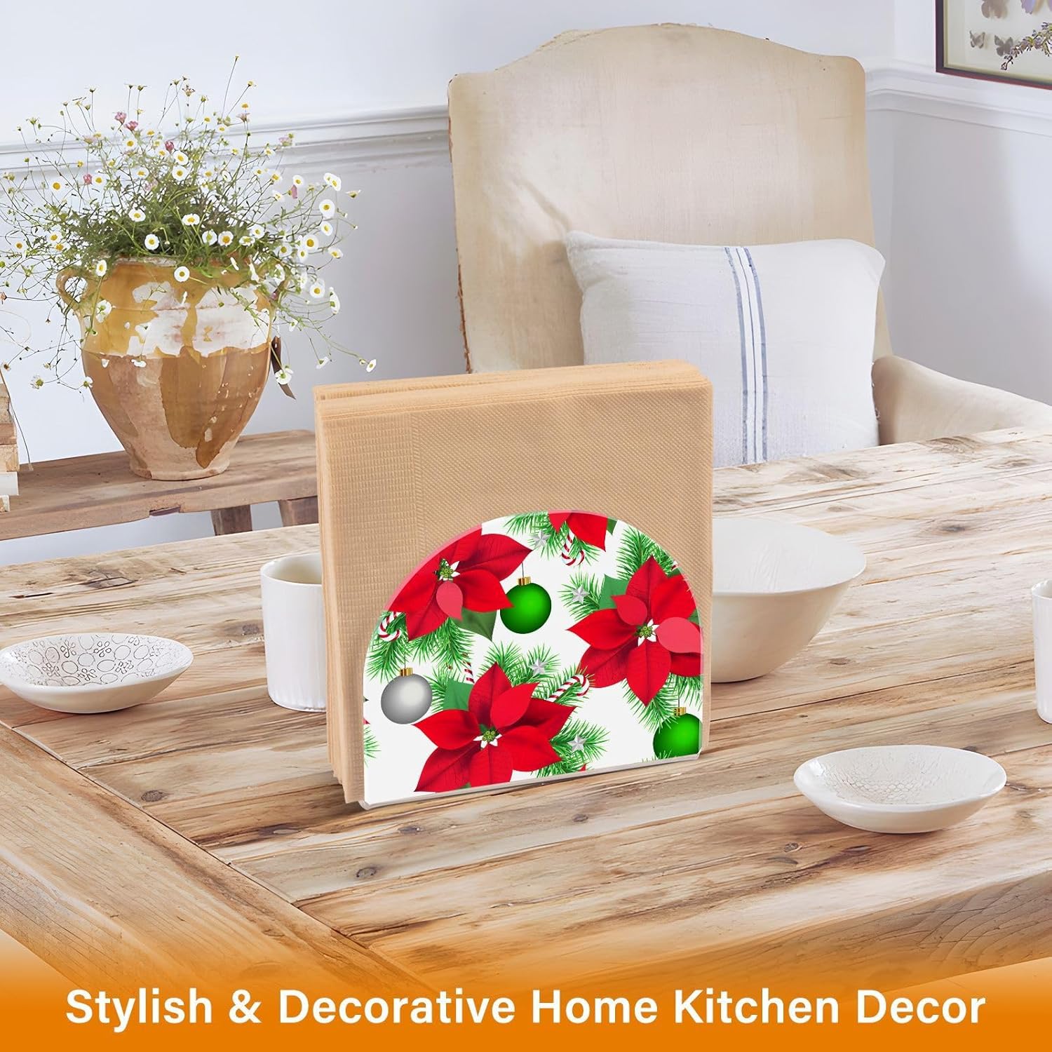 Christmas Poinsettia Flowers Balls Napkin Holder for Table Paper Napkins Holder Acrylic Tissue Dispenser Kitchen Dining Room Bathroom Party Car Decor