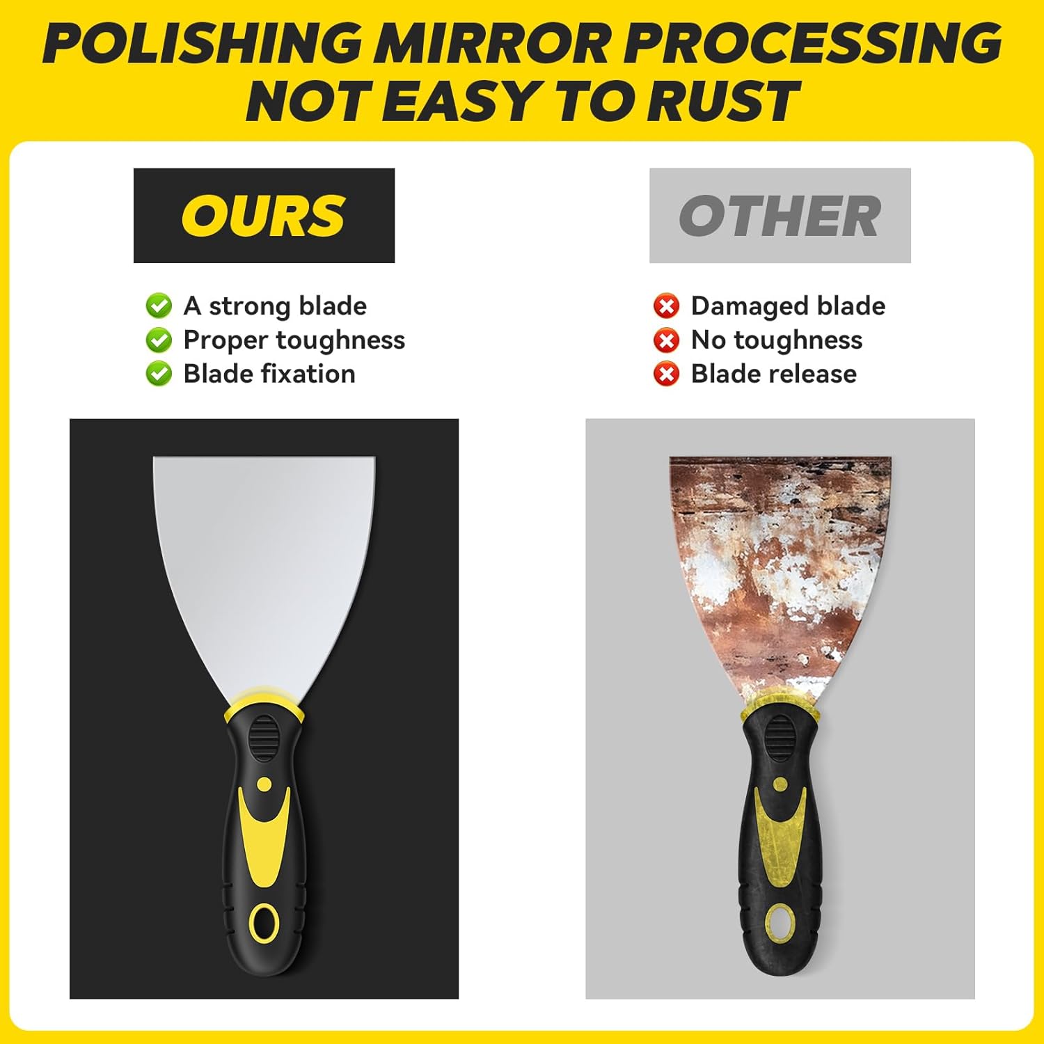 - Comfortable Grip: The soft handle of the spackling knife set is made of high quality PP&TPR material, with non-slip patterns on both sides and finger guide rail on both sides, which gives you a comfortable edge to grasp, with special ergonomic handle design on drywall joint knife facilitates drywall work in large area conveniently and quickly, helping reduce hand fatigue when using drywall scraper tool