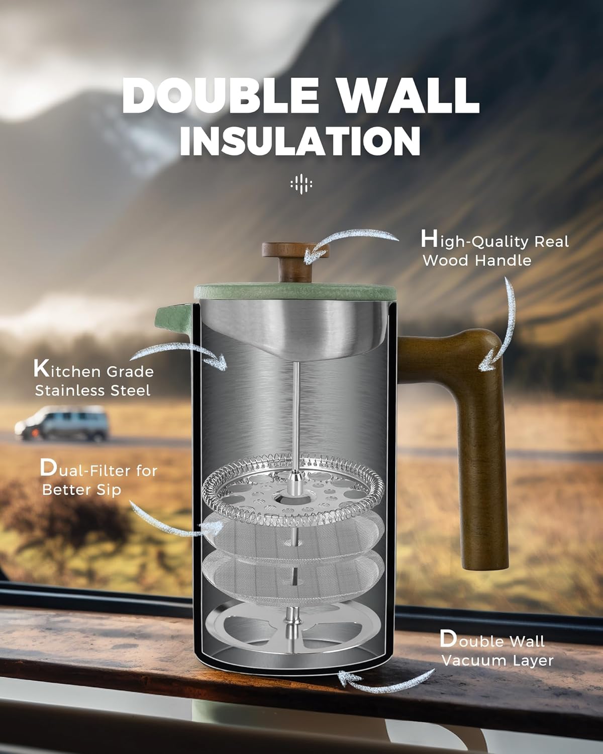 POLIVIAR French Press Coffee Maker, 34 oz Coffee Press with Real Wood Handle, Double Wall Insulation & Dual-Filter Screen, Food Grade Stainless Steel for Good Coffee and Tea JX2023-FPLN