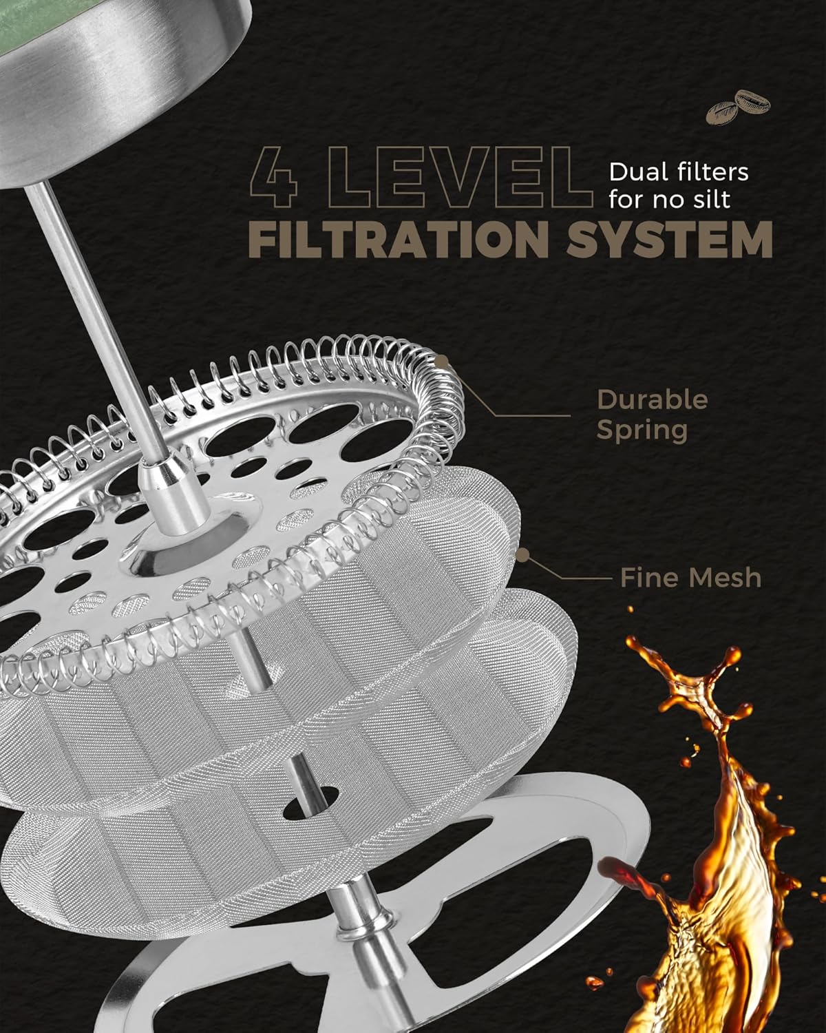 - A GOOD COFFEE PERCOLATOR WILL FILTER OUT THE SEDIMENT BUT NOT THE TASTE AND AROMATIC COFFEE OILS.This press maker is designed with dual-filter screen and composed of a sandwich of steel mesh held in place to increase the smoothness of the brew and keep the orginal taste of grounds.