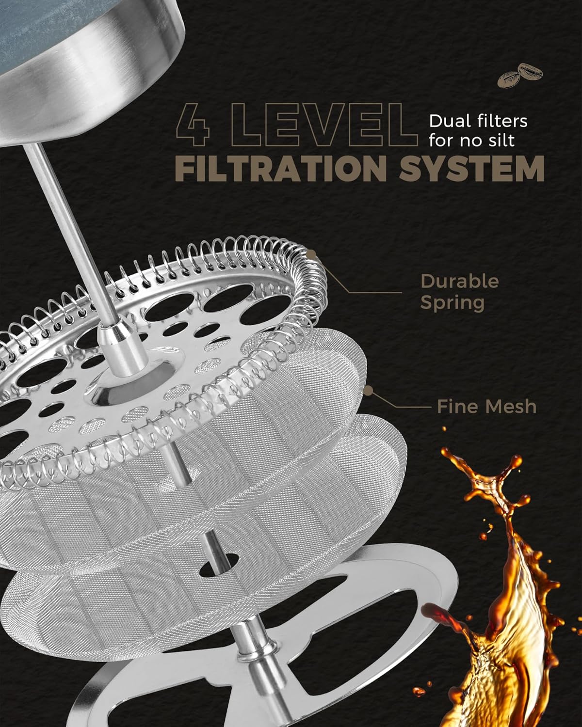 - LOOKING FOR COFFEE PRESS FOR MATCHING UP YOUR KITCHEN? We, the POLIVIAR french press coffee maker will be your smart choice. While the coffee pot is made from food grade stainless steel with stylish long-lasting coating, It is easily to match up your kitchenwares and your kitchen's theme. Also, the ergonomic handle with real wood will maximize the fantastic time of grounds you loved.