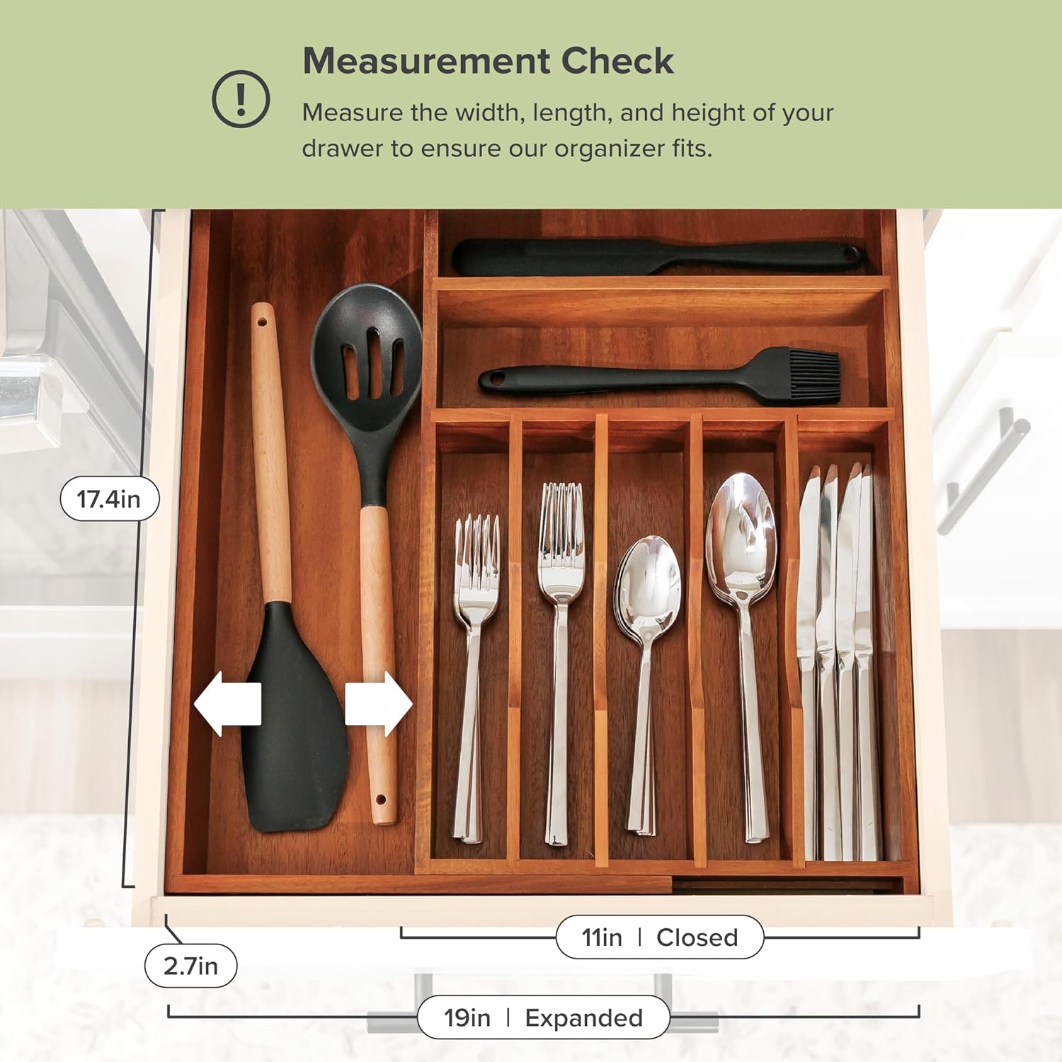 - Enhanced Drawer Storage: This 8-compartment (7 fixed + 1 adjustable) acacia organizer, measuring 17.4 inches in length and 2.7 inches tall, maximizes your smaller drawer’s storage potential. It expands from 11 inches to 19 inches in width, accommodating any width in between. Unlike most drawer organizers that maintain a 2-inch height, the additional 0.7” in height remarkably amplifies storage capacity when filling the organizer with flatware and utensils.