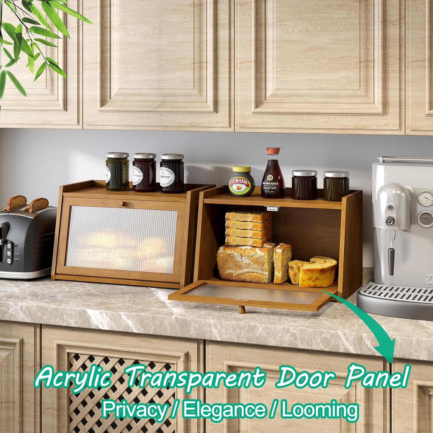 Bread Box for Kitchen Counter, Large Bamboo Bread Storage Container with Wavy Arcylic Door, Bamboo Wooden Farmhouse Bread Box for Your House (Brown, Medium)