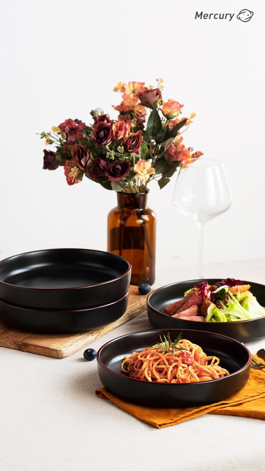 famiware Mercury Pasta Bowls Set of 4, 33 oz Large Salad Bowls, Ceramic Pasta Plates Bowls, Serving Bowls for Kitchen, Microwave & Dishwasher Safe, Black