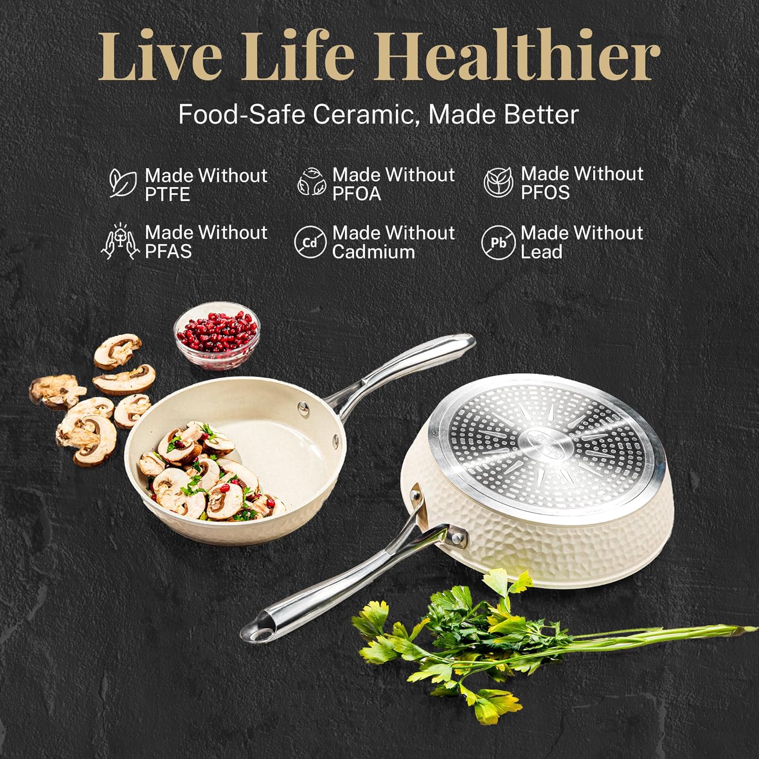 Gotham Steel Hammered 15Pcs Ceramic Cookware Set Nonstick, Induction Pots and Pans Set Non Stick with Bakeware Set & Steamer for Cooking, Non Toxic PFOA PFOS Free, Oven & Dishwasher Safe, Cream White