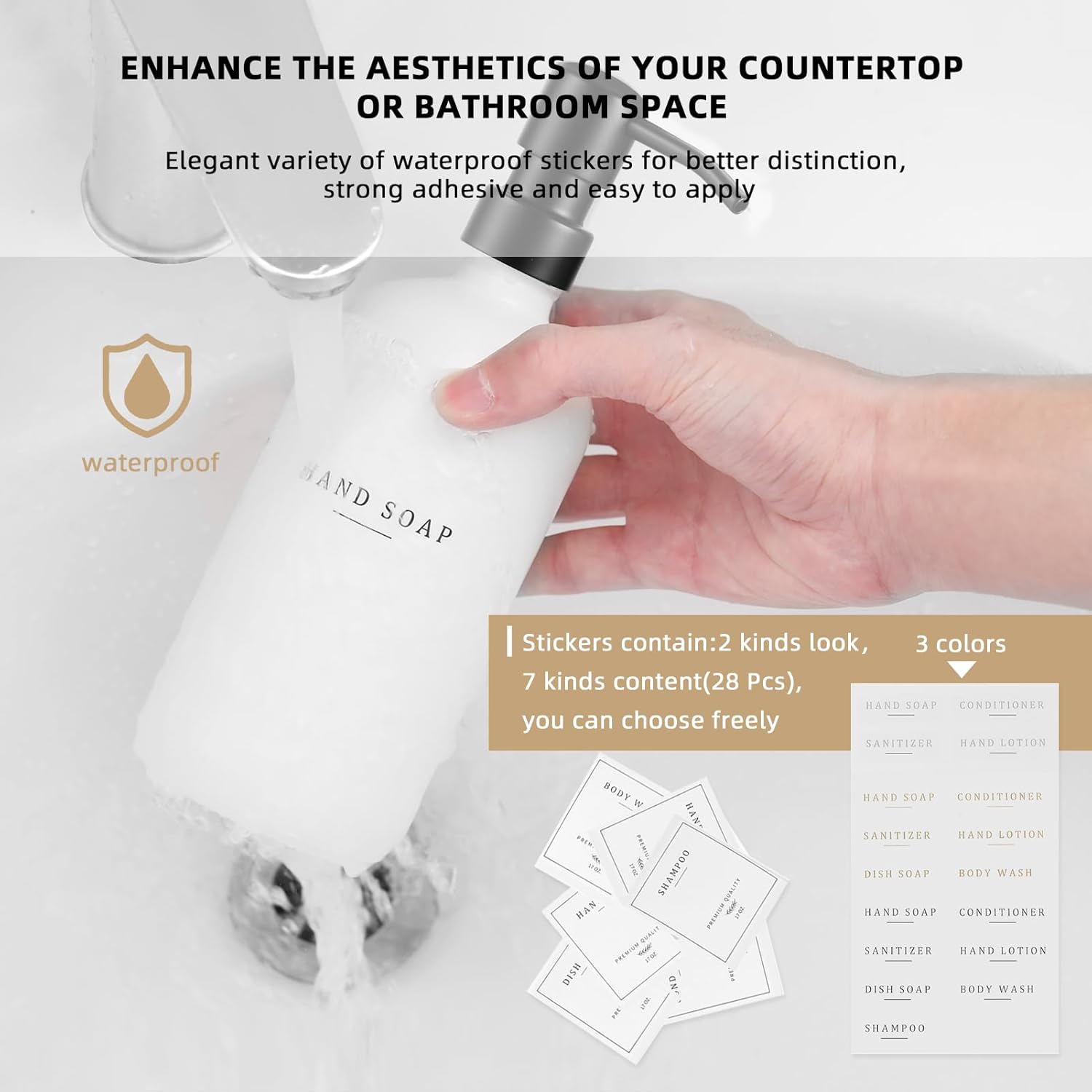 - Elevating your kitchen and bathroom experience:This dish soap dispenser for kitchen with minimalist modern farmhouse chic style waterproof sticker,21pcs,pretty versatile customize the labels to your taste, can also change the labels out if you decide to change the look/colors match your decor. Waterproof material don't peel even when it gets wet and moist every day, perfect for the modern farmhouse vibe or really any kitchen decor.