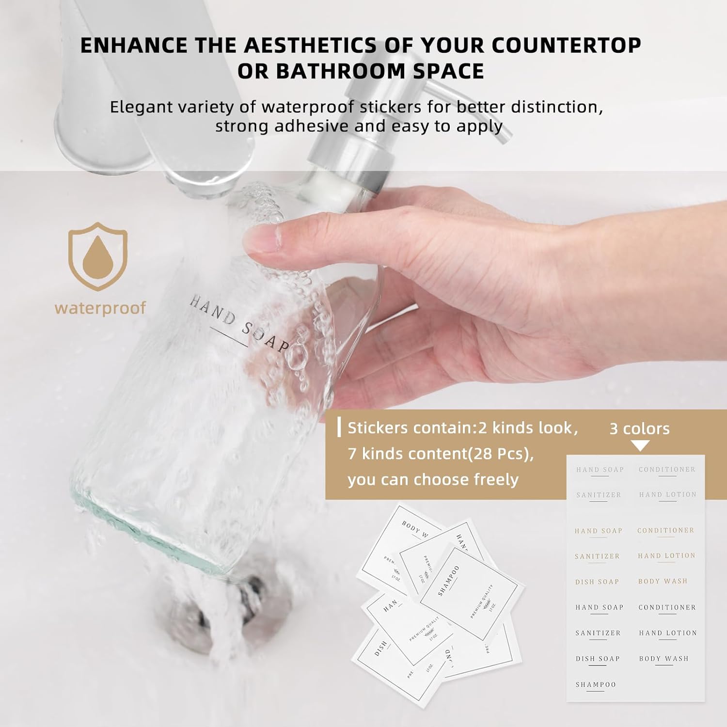 - A practical and aesthetically pleasing addition to your home: This soap dispenser set contains 2 reinforced hard glass bottles with sleek and stylish stainless steel pump heads for your liquid soap; hand soap, dish soap, hand lotion, body wash, shampoo, conditioner labels, 1 silicone funnel, 1 waterproof non-slip tray, this set has transformed mundane routines into moments of indulgence and style.