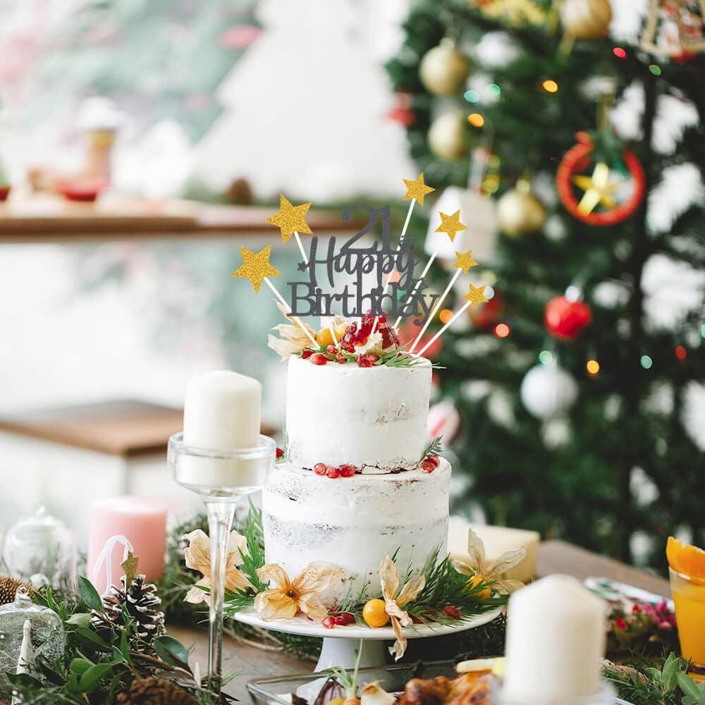 Glittery 21st Happy Birthday Cake Topper with Star,Personalised 21 Birthday Cake Toppers Party Decorations Party Supplies for Boys Girls Black Gold