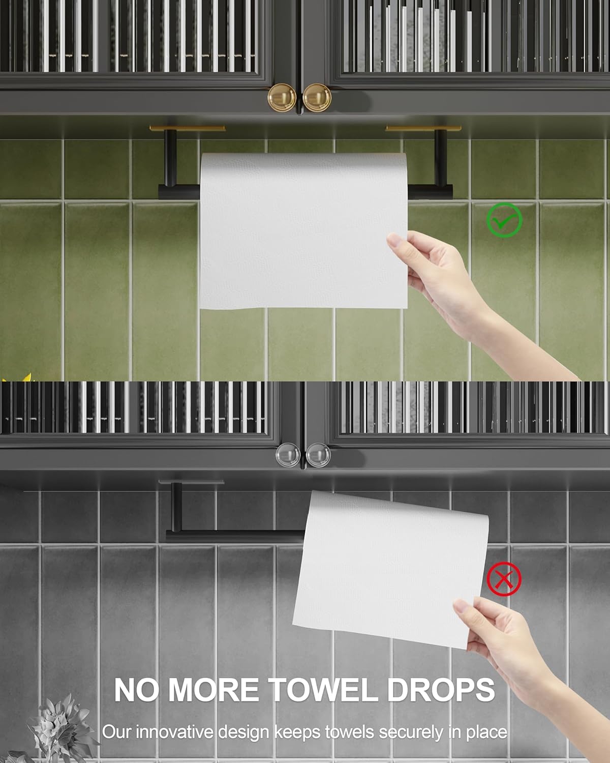 - [Two Installtion Methods] This paper towel holder under cabinet has two installation methods: pasting and punching. Adhesive ensures kitchen towel holder adhere firmly to the wall (pressing firmly on the desired area for more than 30 seconds, waiting for 24 hours for greater adhesive effect). We also provide wall mounted accessories. This kit includes all the necessary installation equipment