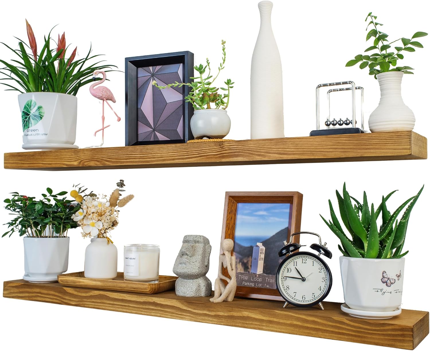 Rustic Floating Shelves 48 inch Long 8 inch deep Set of 2, Solid Wood Wall Shelves for Bedroom Living Room Kitchen,Book Shelf for Wall, Wall Mounted Shelves with Hidden Bracket- Gold Oak
