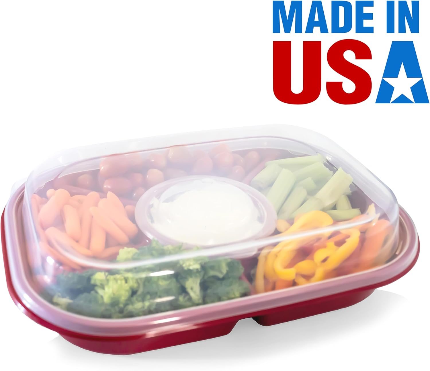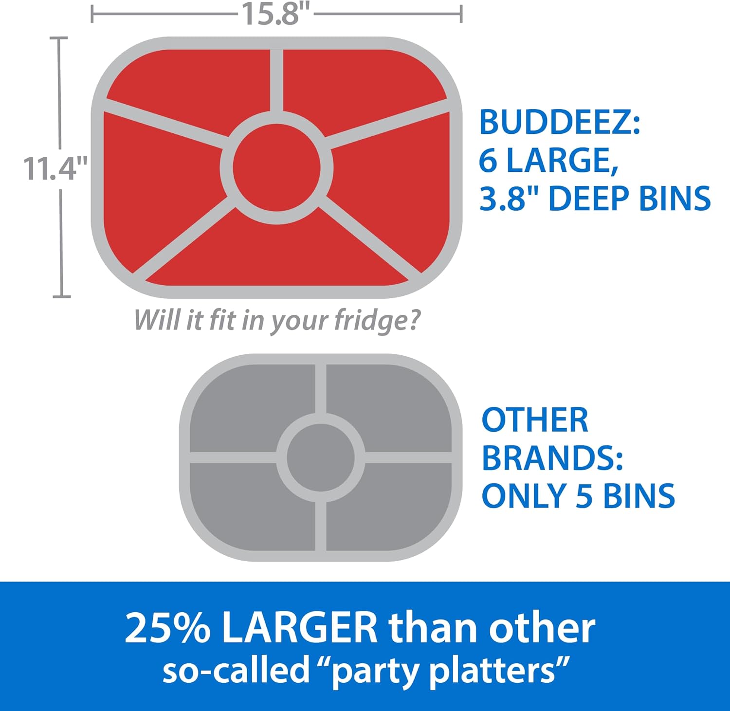Buddeez Red Jumbo Divided Serving Tray - 6 Bins for Party Platter with Lid, Snackle Box Container, Appetizers, Desserts, Snacks & More