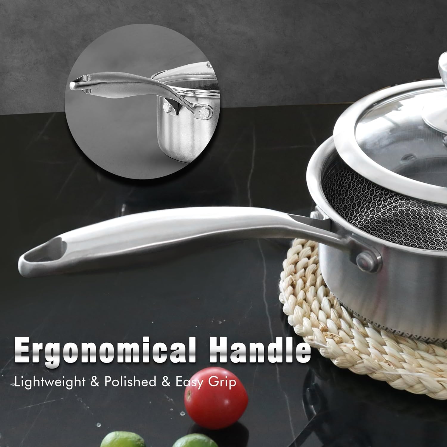 - Practical & Healthy: The sauce pan is made of high quality 18/10 stainless steel, which is strong and durable to prevent scratches, corrosion, warping and rusting. A honeycomb carving is etched into the interior of the cookware, making it 10 times more non-stick than traditional stainless steel pans! Non-toxic, Free of PTFE, PFOA, PFAS, lead, cadmium and other toxic substances.