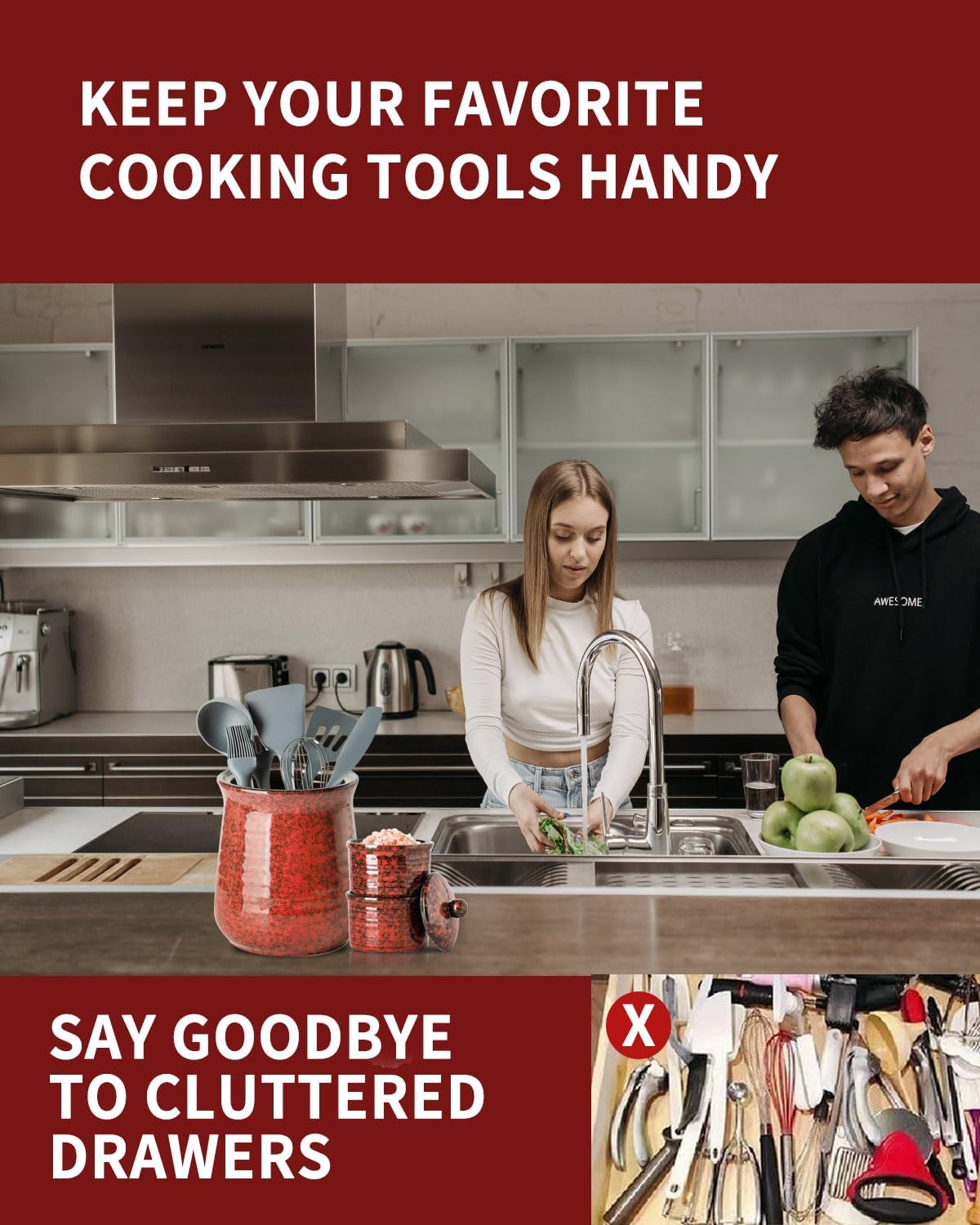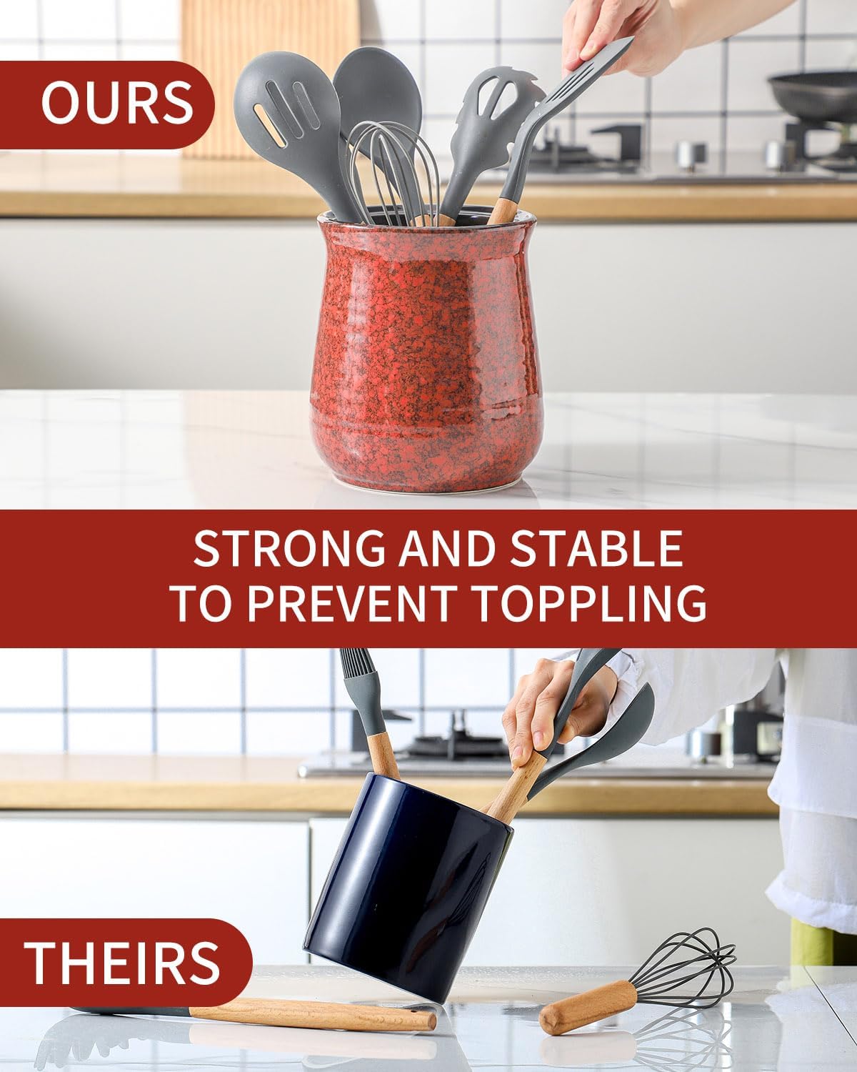 Hasense Kitchen Utensil Holder for Countertop, 7.1” Large Ceramic Utensil Crock, Utensil Caddy, Utensil Organizer and Rustic Table Decor for Spatulas, Red