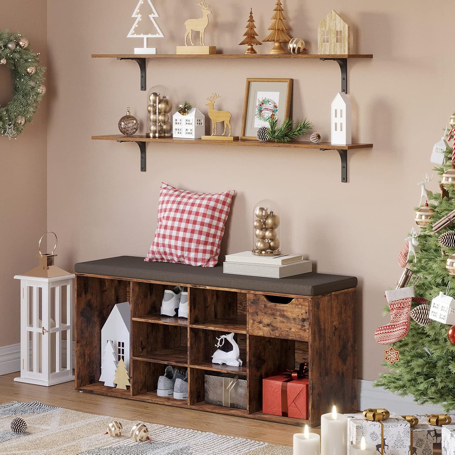 DINZI LVJ Long Wall Shelves, 47.3Inch Wall Mounted Shelves Set of 4, Extra Large Wall Storage Ledges with Sturdy Metal Brackets for Living Room, Bathroom, Bedroom, Kitchen, Rustic Brown