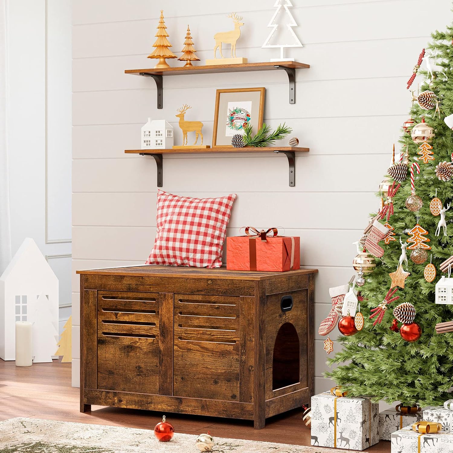DINZI LVJ Long Wall Shelves, 31.5Inch Wall Mounted Shelves Set of 4, Extra Large Floating Storage Ledges with Sturdy Metal Brackets for Living Room, Bathroom, Bedroom, Kitchen, Rustic Brown