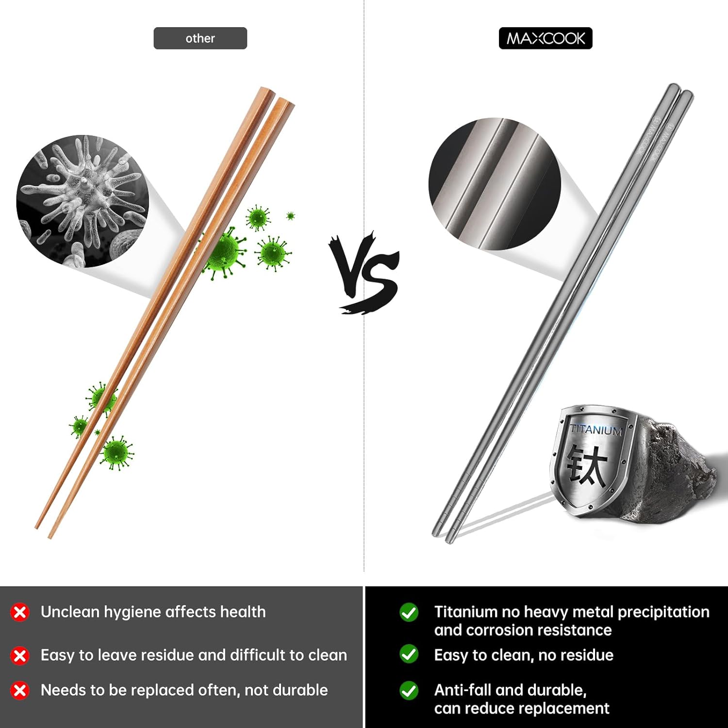 - 【Healthy Titanium Chopsticks】Titanium has no heavy metal precipitation, good compatibility with the human body, acid and alkali corrosion resistance, non-rusting, non-stringing properties, healthy titanium chopsticks are the ideal material for kitchen utensils