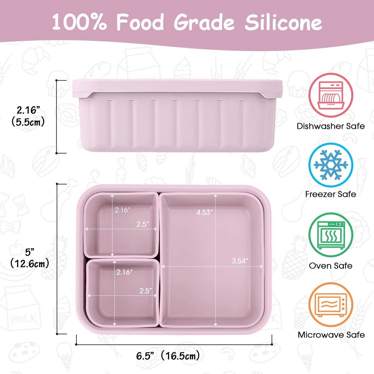- 【Three Removable Silicone Containers】Customize the storage sections on your container every time you pack!!! Flexible designs are perfect for portioning out different foods,such as light snacks,lunch, dinner,sandwiches, leftovers, and desserts. Dishwasher, microwave, freezer and oven safe