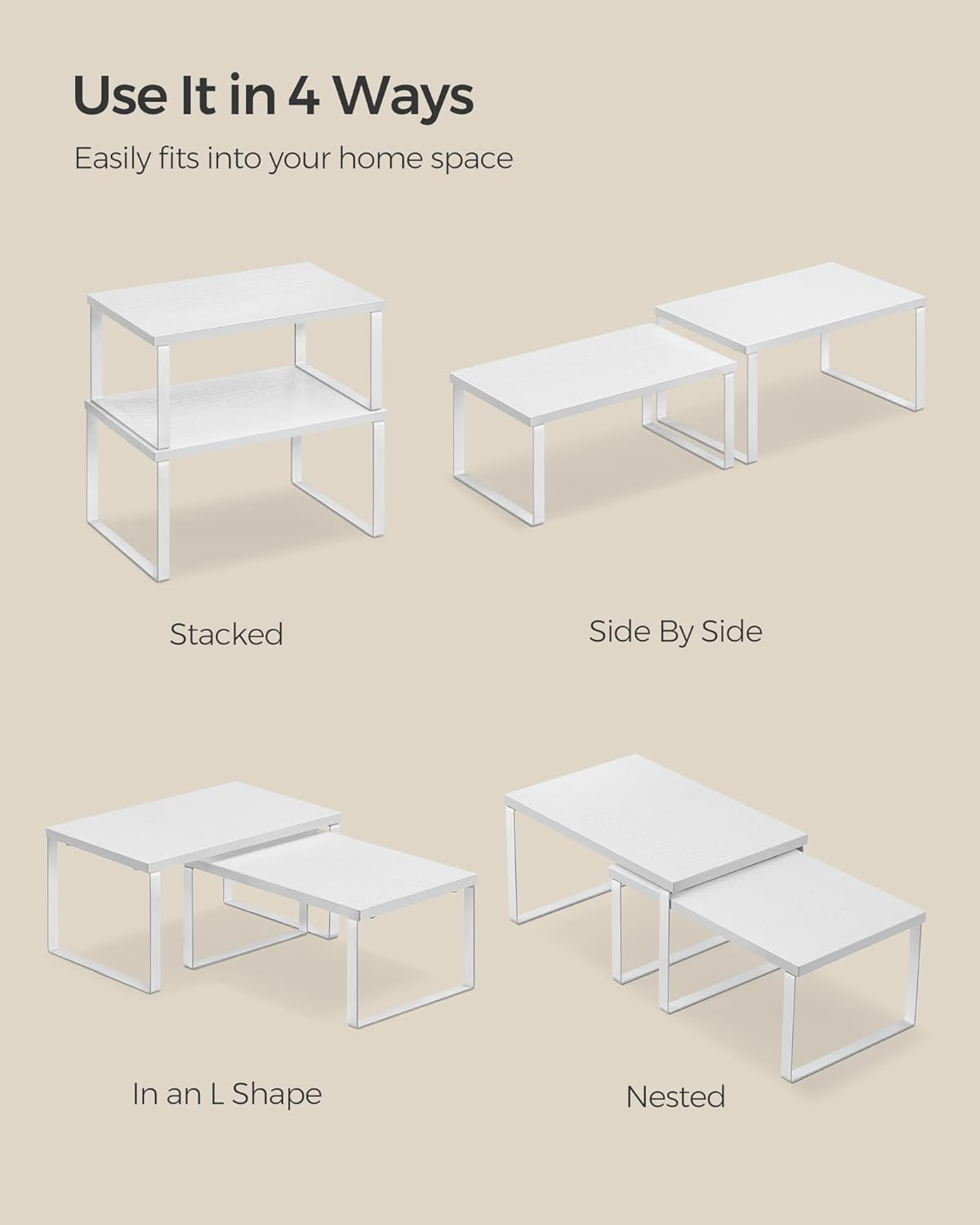 - [Adjustable] With their unique design, with one slightly smaller than the other, these shelf organizers can be stacked on top of one another, nested, used separately, or even in an L-shape. Adjust them how you want to perfectly fit your kitchen space