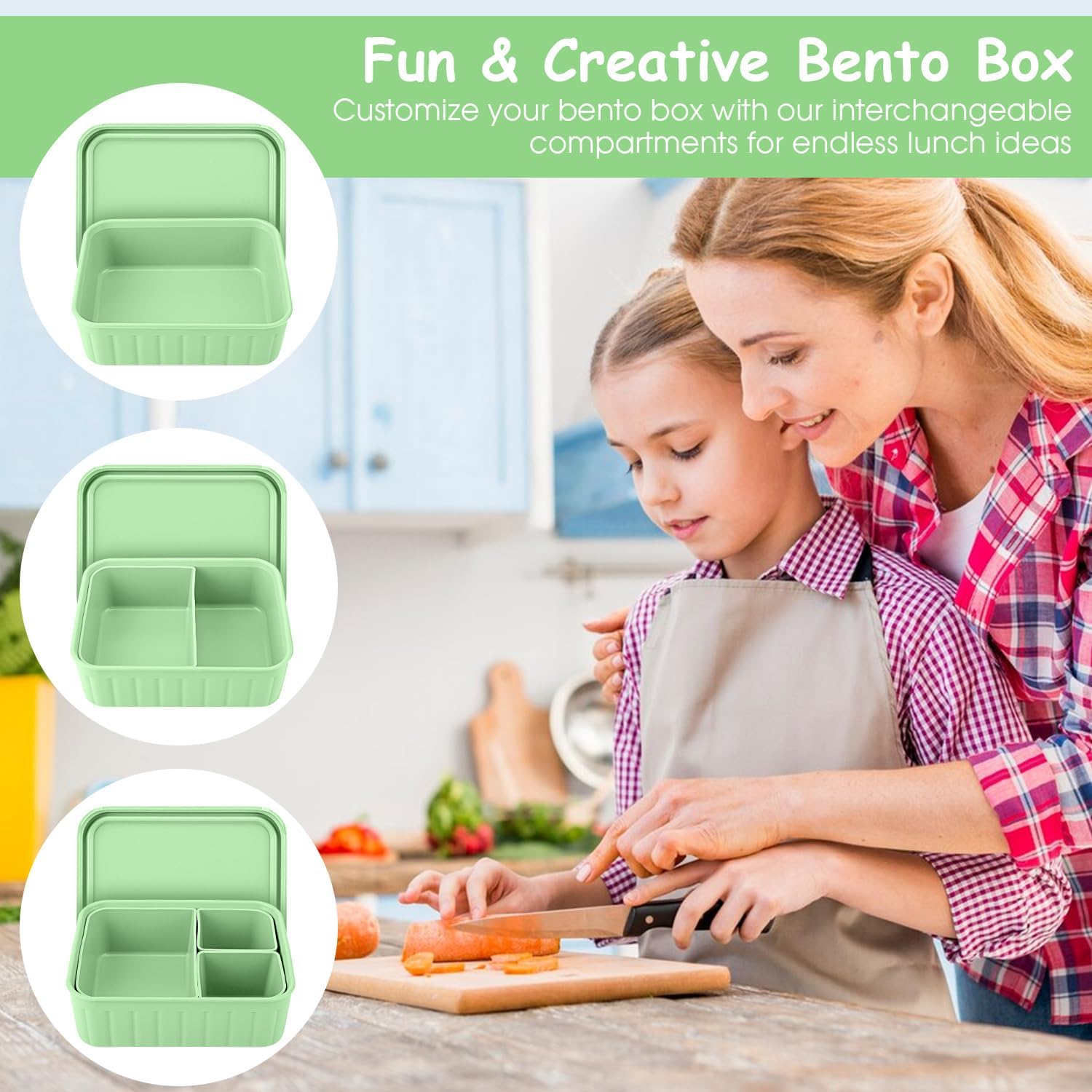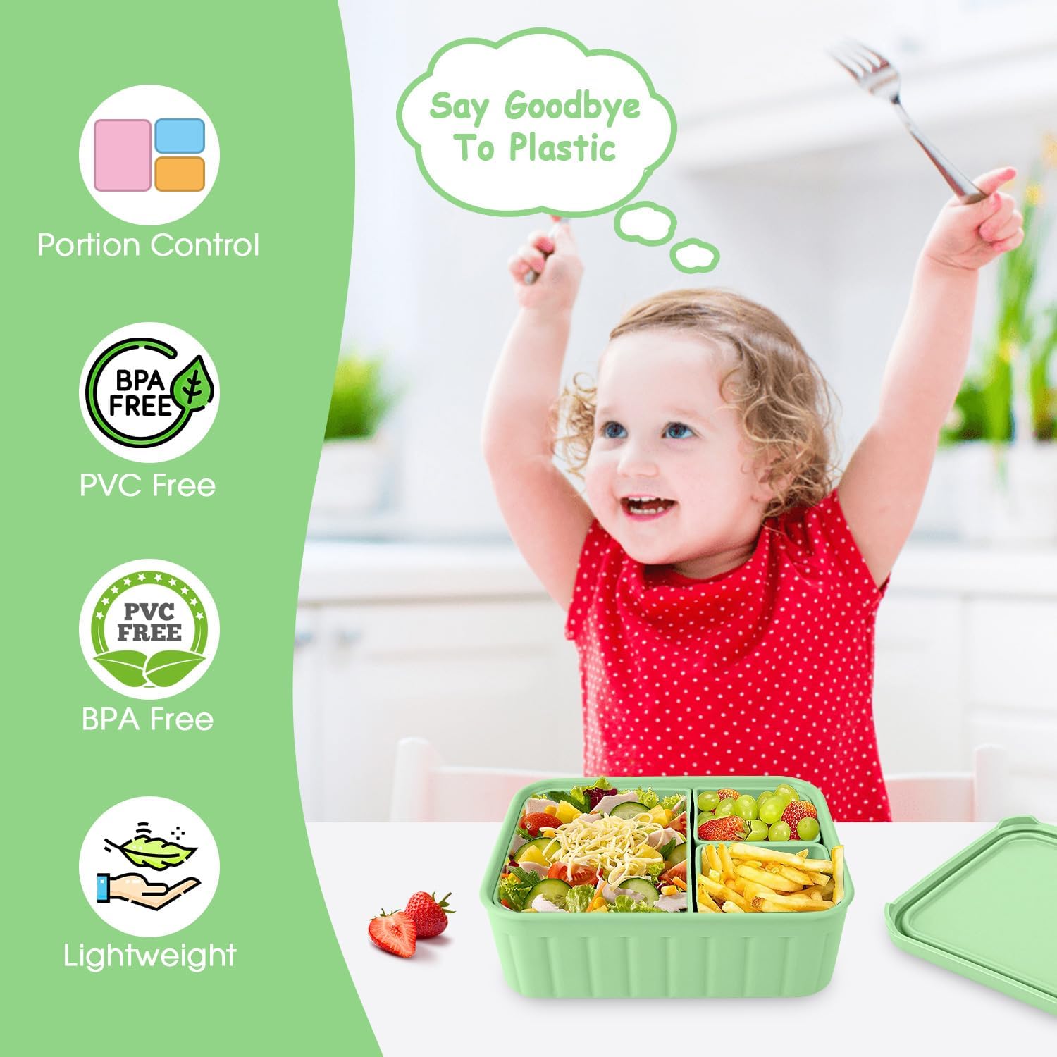 Bento Lunch Box for Kids-Reusable Silicone Kids Bento Box Lunch Container Leakproof Lunchbox Meal Prep Food Storage Containers with 3 Removable Compartments–Dishwasher Safe/BPA Free/Portion Control