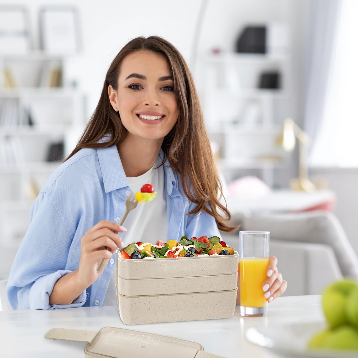 Bento Box Adult Lunch Box, Stackable 3-In-1 Compartment Bento Containers Kit with Spoon&Fork, Wheat Straw Meal Prep Containers Beige