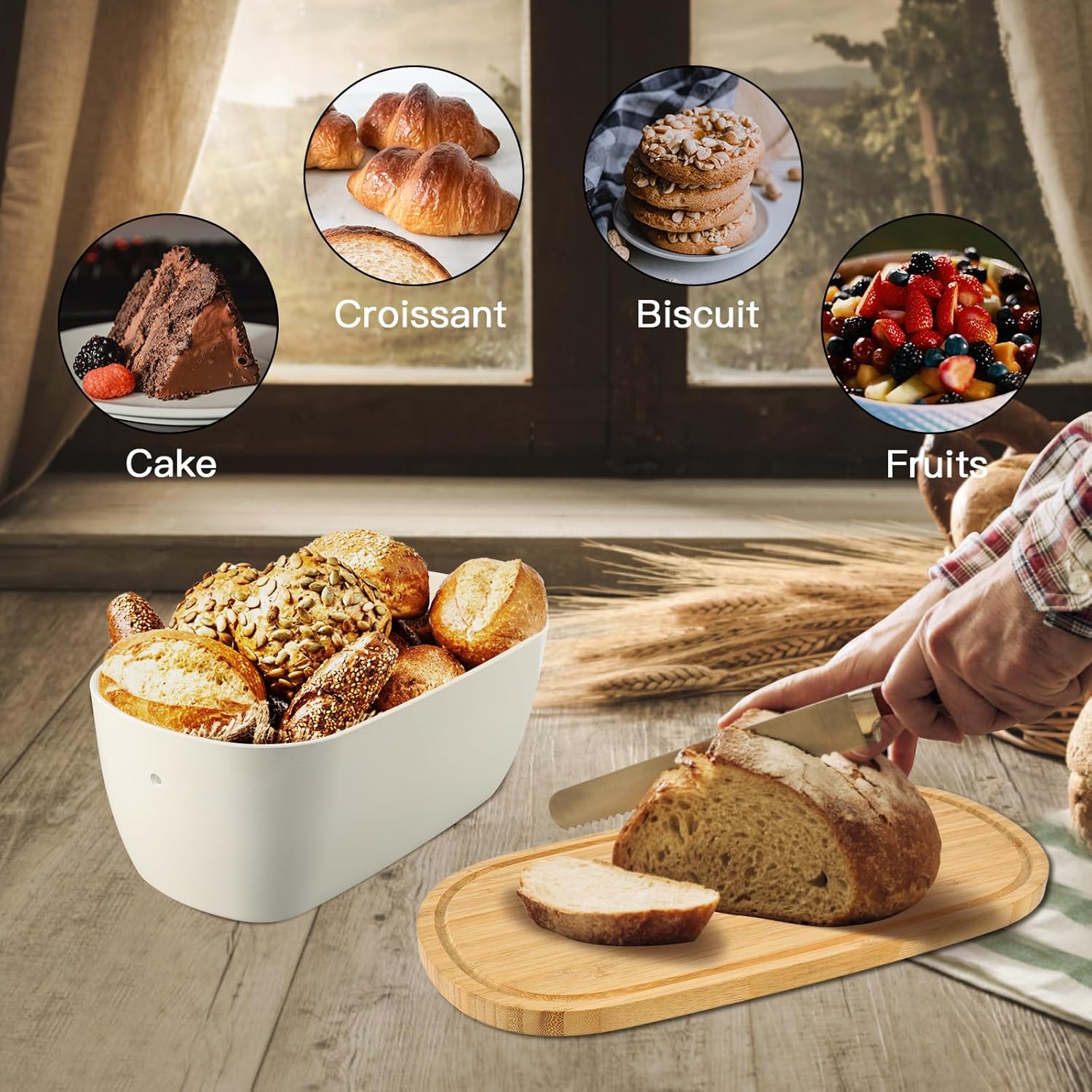 Bread Box for Kitchen Countertop - Bamboo Fiber Bread Bin with Reversible Cutting Board Lid, Juice Groove - Ventilated, Multi-Functional Storage Keeper for Freshness (14.2x7.8x5.5In, White)