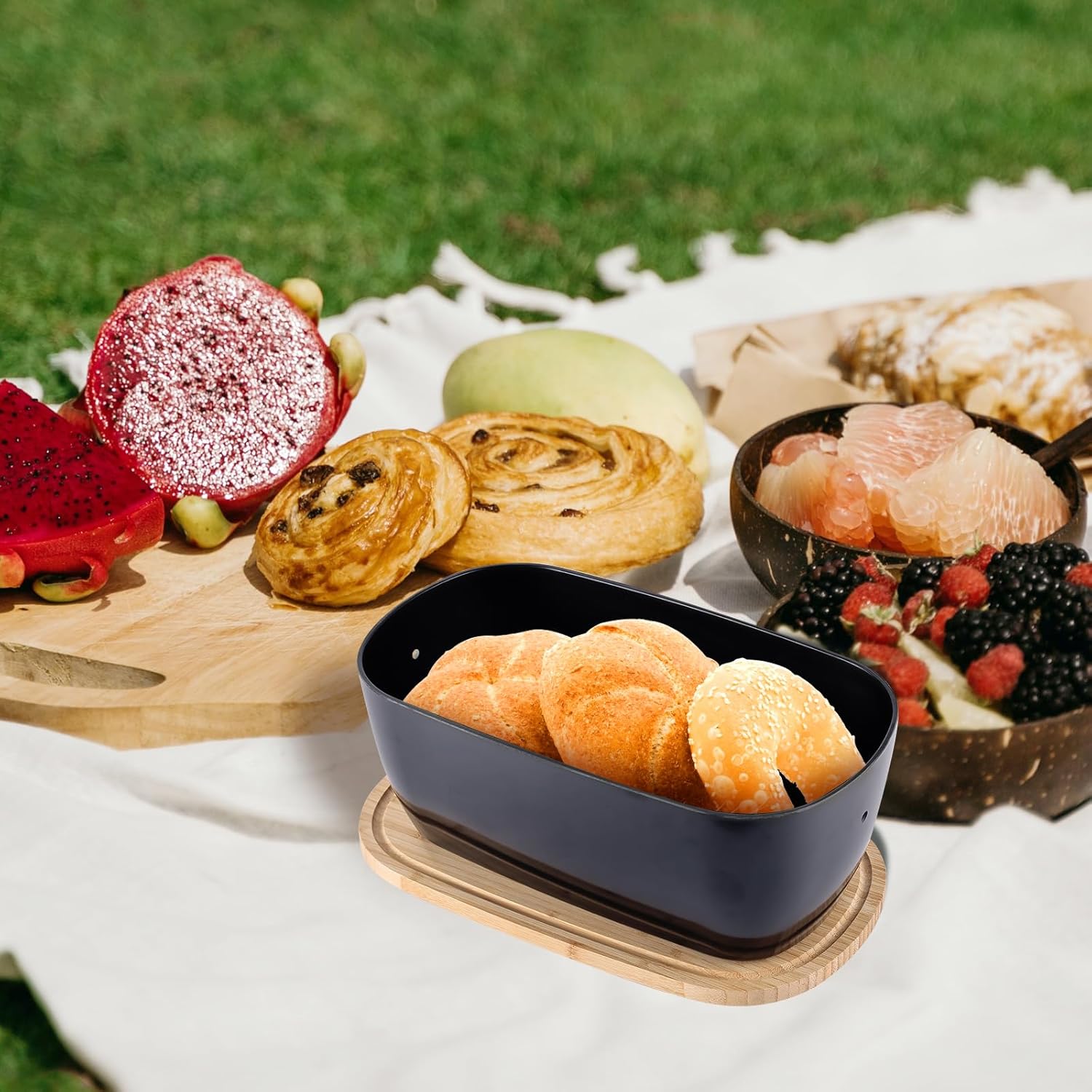 - Dual-Purpose Bamboo Lid:The sturdy bamboo lid acts as a cutting board (front) with a juice groove to catch liquids and a crumb-collecting surface (back). Perfect for slicing fruits, veggies, or serving bread and cheese.