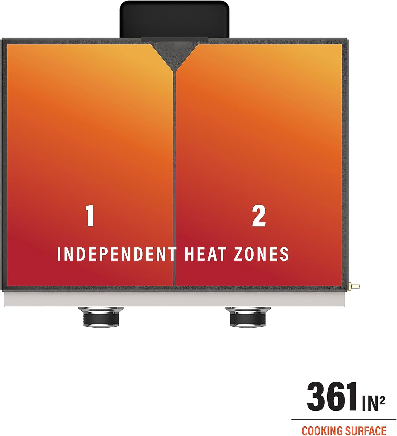 - Two Evenly Heated Zones: Cook a few different items at different temperatures on the same griddle top thanks to two independently heated burners that put out a combined 21,000 BTUs and evenly heat the whole griddle top.
