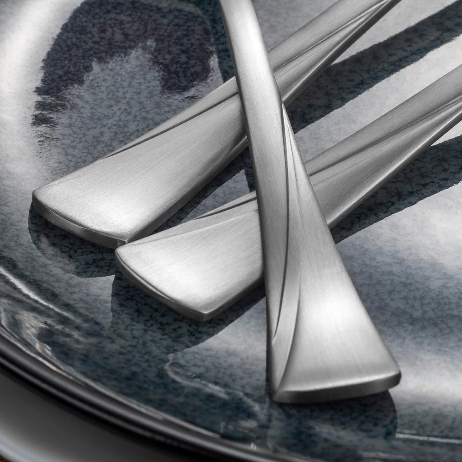 - DESIGN: Bold shapes, cutting lines. This is a very modern art style silverware set.We have designed two different finishes, mirror polish and satin matte, to present different effects