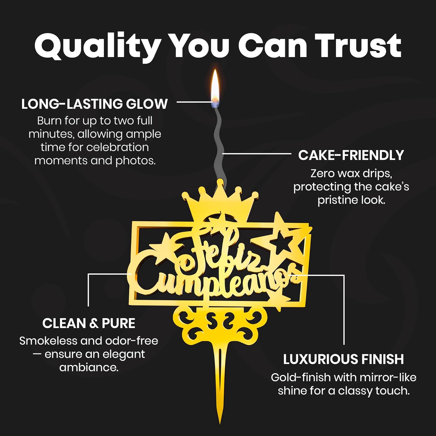 Feliz Cumpleanos Reusable Gold Romantic Cake Candle - Luxury Cake Topper Candle for Birthdays, Weddings & Anniversaries - Reusable Food Safe Acrylic, Shiny Mirror Finish - Happy Birthday Cake Topper