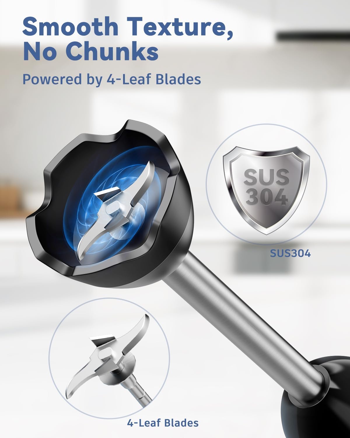 - POWERFUL PERFORMANCE AND DURABLE: 800W Heaviest dust copper motor paired with two professional Titanium steel 4 blade and ice crush blade rotation system can handle the toughest blending tasks effortlessly. LINKChef stick blender immersion quickly pulverizes tough meats, ice cubes, or frozen fruits, resulting in super smooth textures