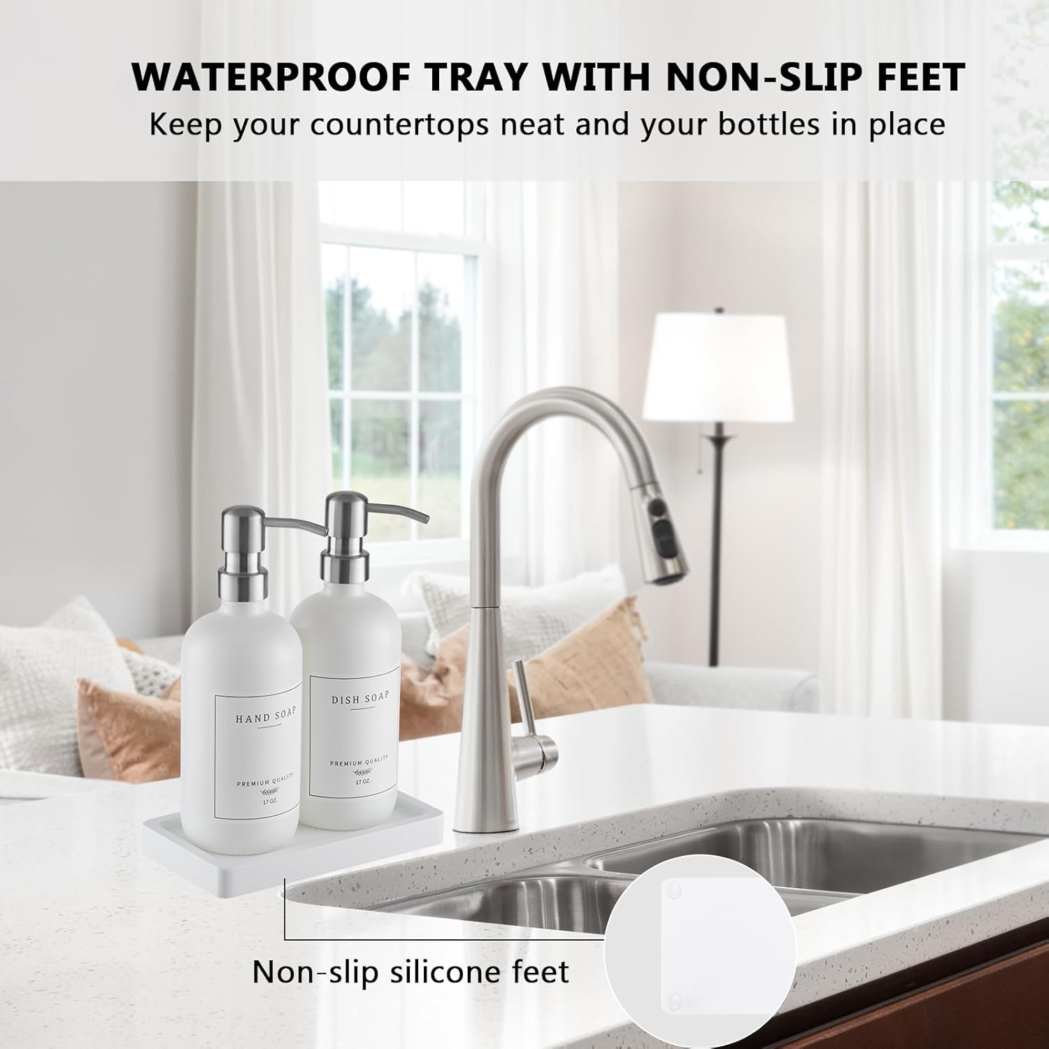 - MORE CLEAN AND ORGANIZED: This farmhouse style bathroom soap dispenser set is elegantly decorative and functional, keeps your kitchen or bathroom clean and classy, the white spill-proof tray with non-slip feet on the bottom is not like other wood that cracks easily, sturdy tray keeps your partner from moving the bottles all around the sink and doesn’t take up much room, make your kitchen area look more tidy and brings joy daily. Absolutely perfect for the modern farmhouse vibe or really any decor.