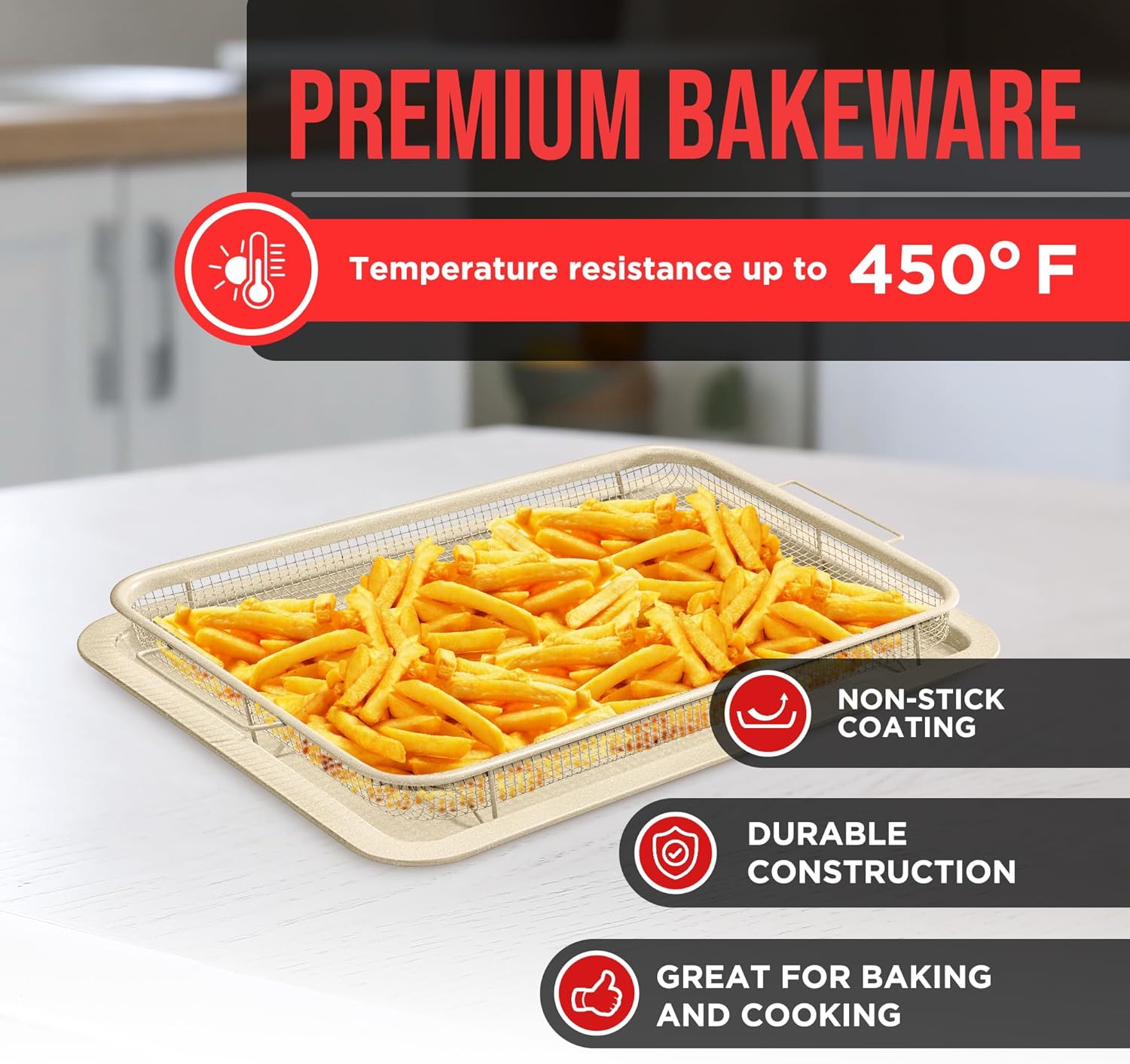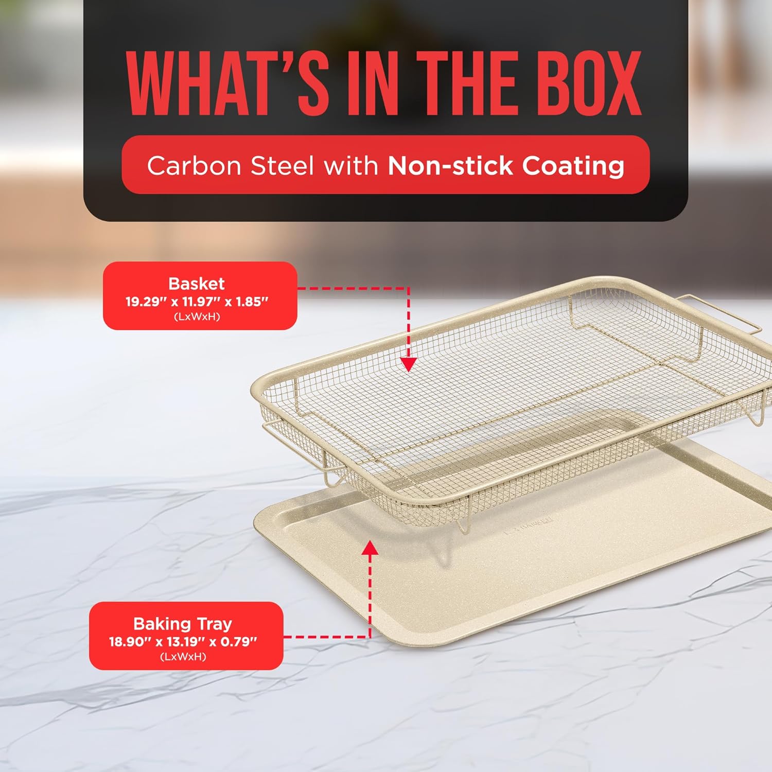 - DELICIOUS CRISPY FOOD - achieve perfectly crispy results with our 2-piece large crisper tray set, consisting of a durable baking tray and a removable basket. Say goodbye to greasy, fatty foods and hello to healthier options cooked in your home oven