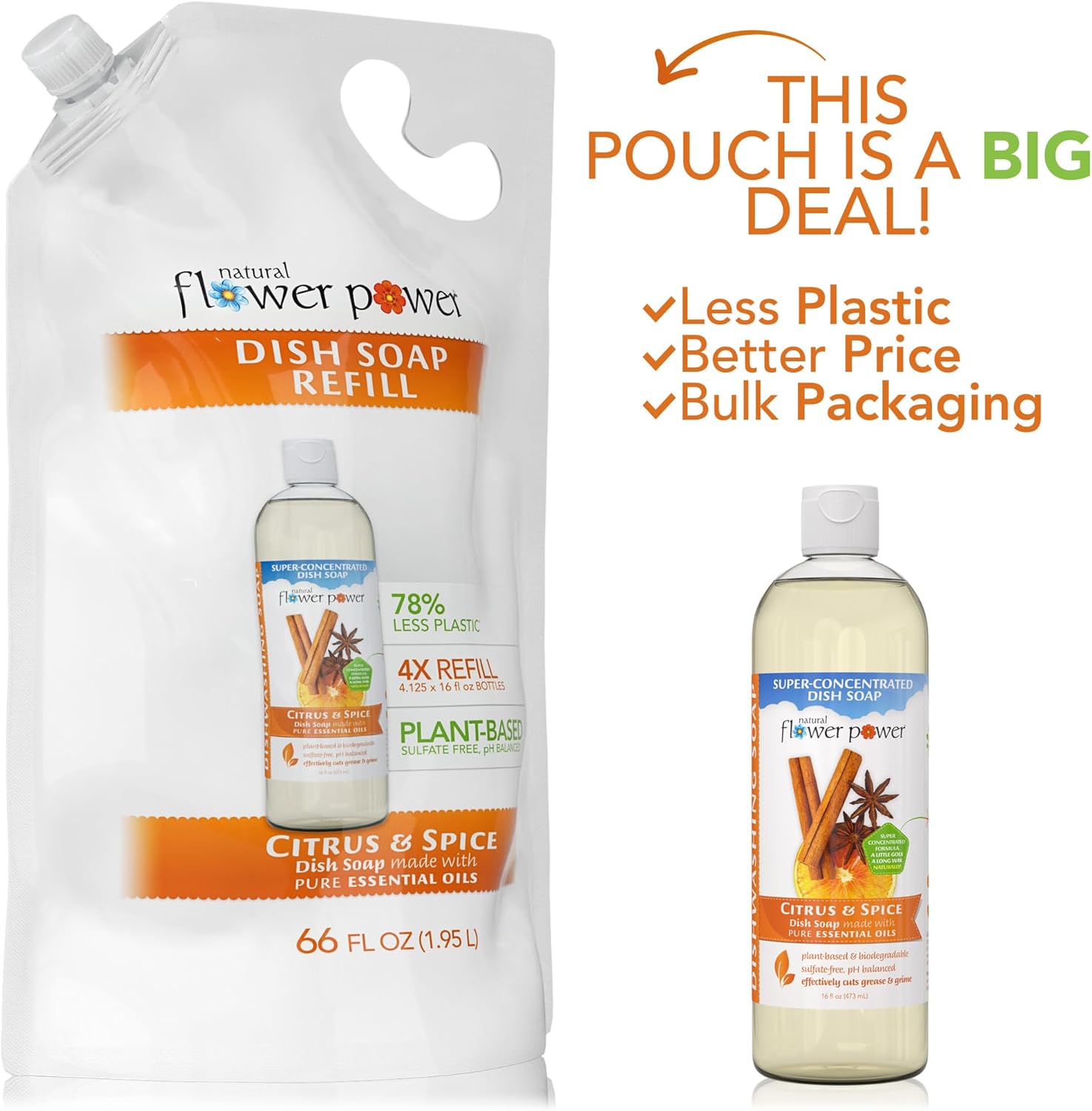 - REFILLS 4X – These 66 fluid ounce refills will refill the 16 fluid ounce bottles 4 times! Our refills use 78% less plastic and are economical for the earth and your wallet. Natural Flower Power Dish Soap Bottles are 16 fluid ounces and come with convenient flip-top lids that will not clog. Available in 5 scents: Citrus & Spice, Lavender, Lemongrass, Peppermint & Lemon, and Free & Clear (Unscented).