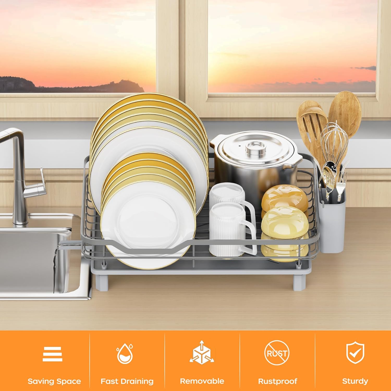 Dish Drying Rack, Stainless Steel Rustproof Dish Rack for Kitchen Counter, Sturdy Dish Drainer with Drainboard, Drainage, Utensil Holder for Various Kitchenware, 16.2"(L) x 12.6"(W), Grey