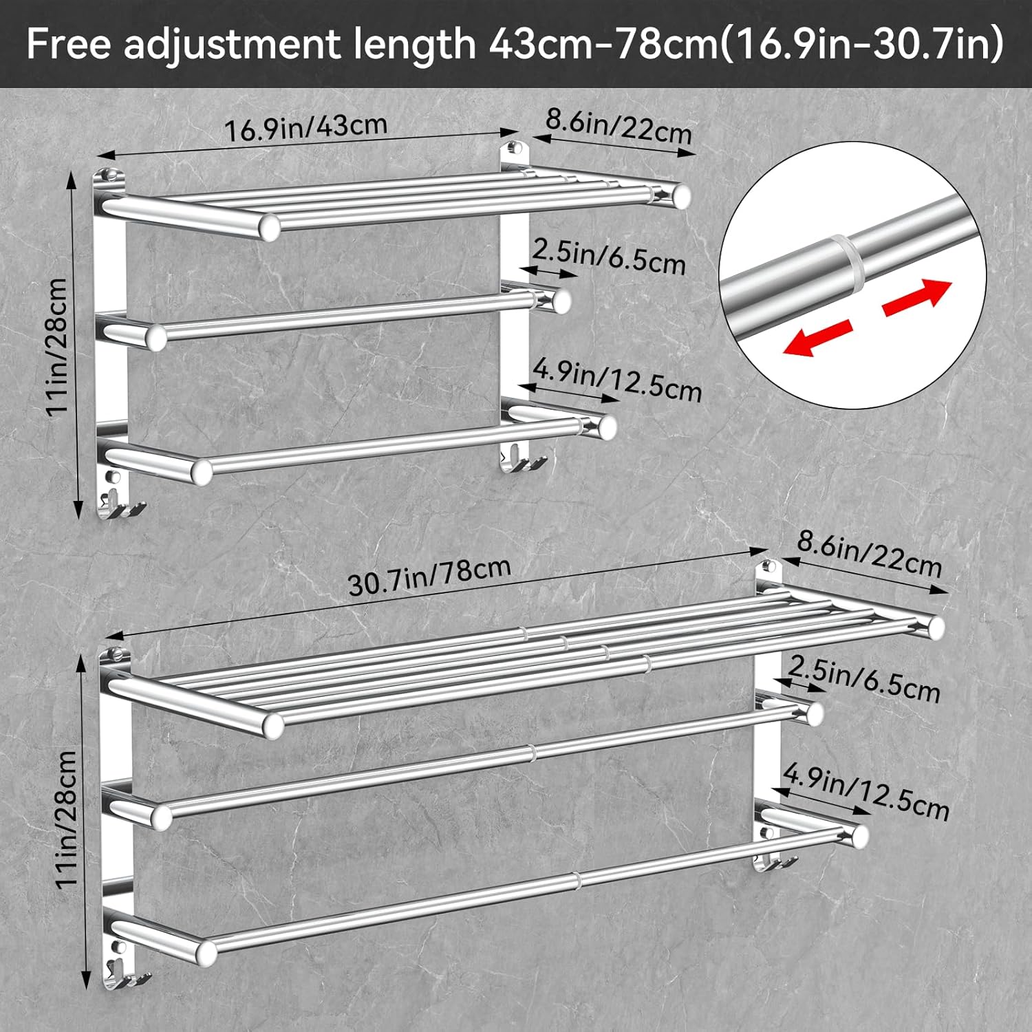 Adjustable Towel Bar for Bathroom Wall Mount17-30.7inch Adhesive Shower Towel Rack Stainless Steel Bath Towel Holders for Toilet Kitchen Double Towel Hanger (3-Layer Towel Rack)