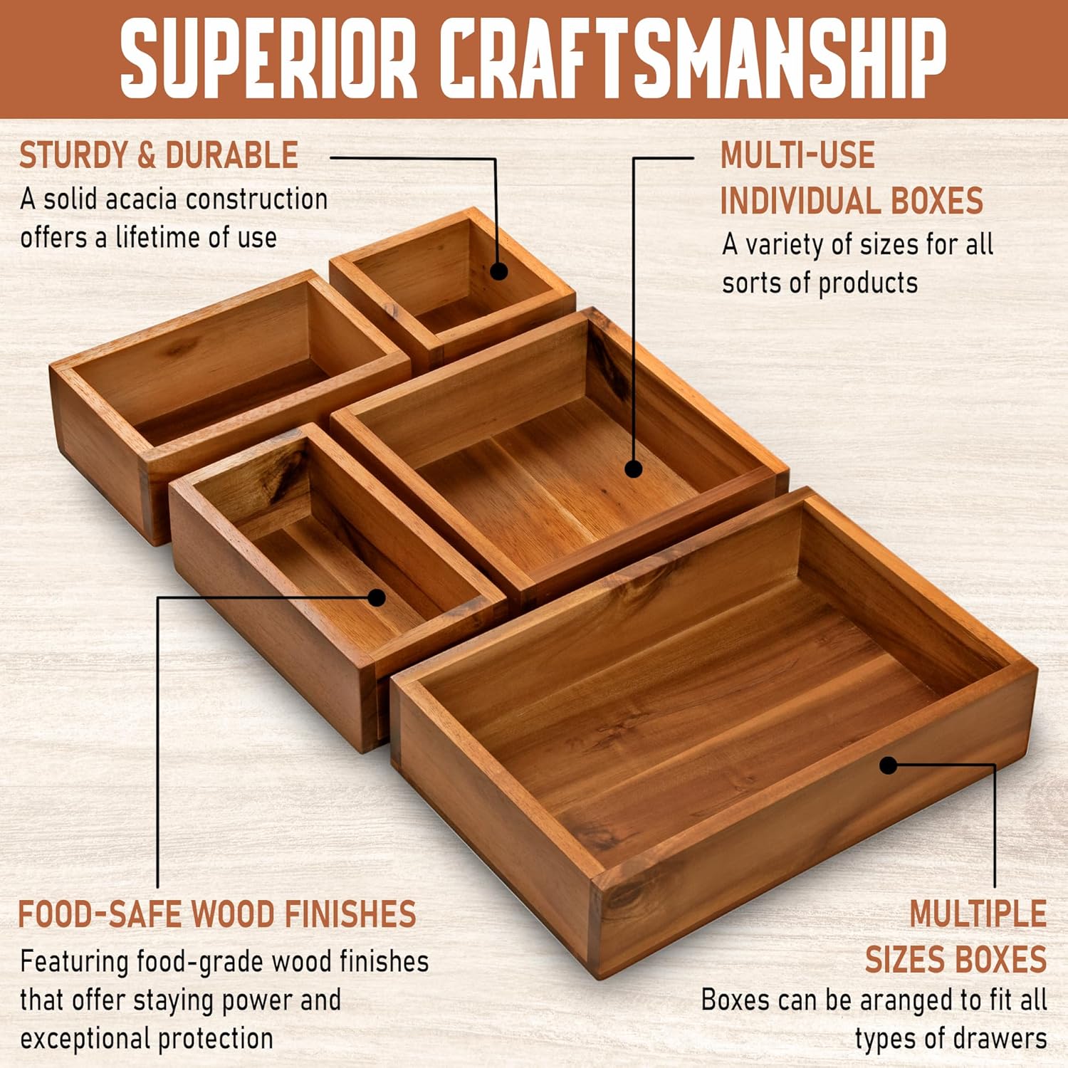 - Superior Craftsmanship Drawer Ensemble: Our kitchen drawer holder acacia drawer organizer box is crafted by skilled artisans with years of experience. The finished storage boxes feature thick wooden edges and a smooth surface, showcasing the excellent workmanship of our dedicated workers in our workshop. Enjoy not only its practical functionality but also its beautiful aesthetic—the variations are endless!