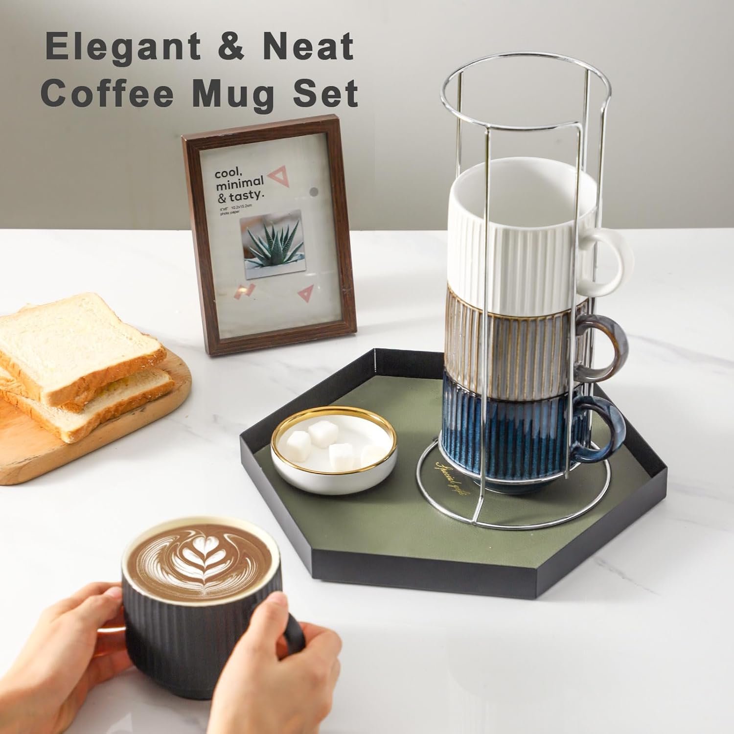 Hasense Coffee Mug Set of 4 with Holder - 15 oz Stackable Large Ceramic Ribbed Latte Cup Set for Cappuccino, Tea, Hot Cocoa, Drinks - Dishwasher & Microwave Safe Multi color