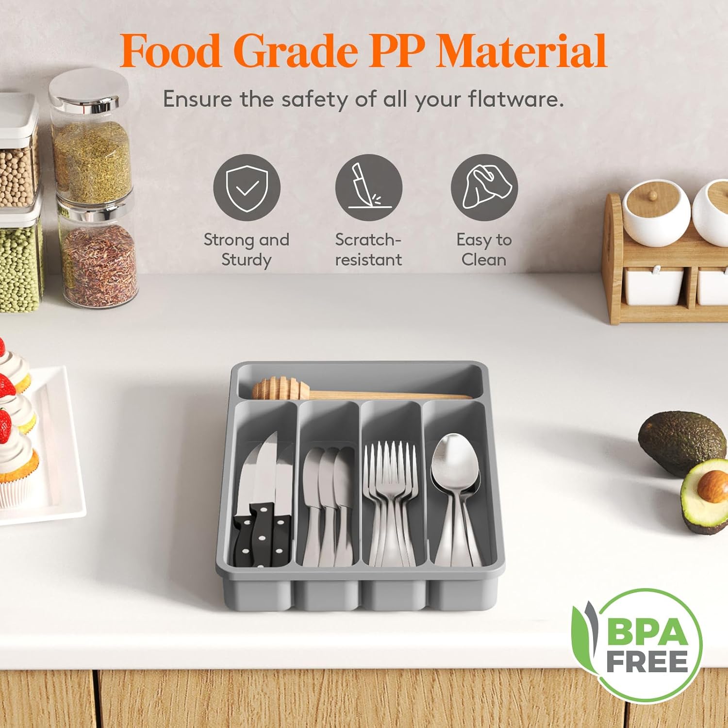 - Robust and Safe: This kitchen drawer organizer is crafted from premium PP material, BPA-free and built to last. It ensures your silverware is stored in a healthy, safe environment for worry-free use