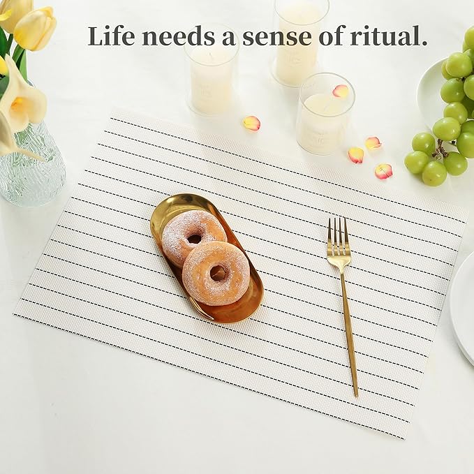 Leetaltree White with Black Stripes Placemats Set of 4 - Heat Resistant Non-Slip Place mats for Dining Table, Washable Durable PVC Vinyl Woven Table Mats(White Stripes, 4)