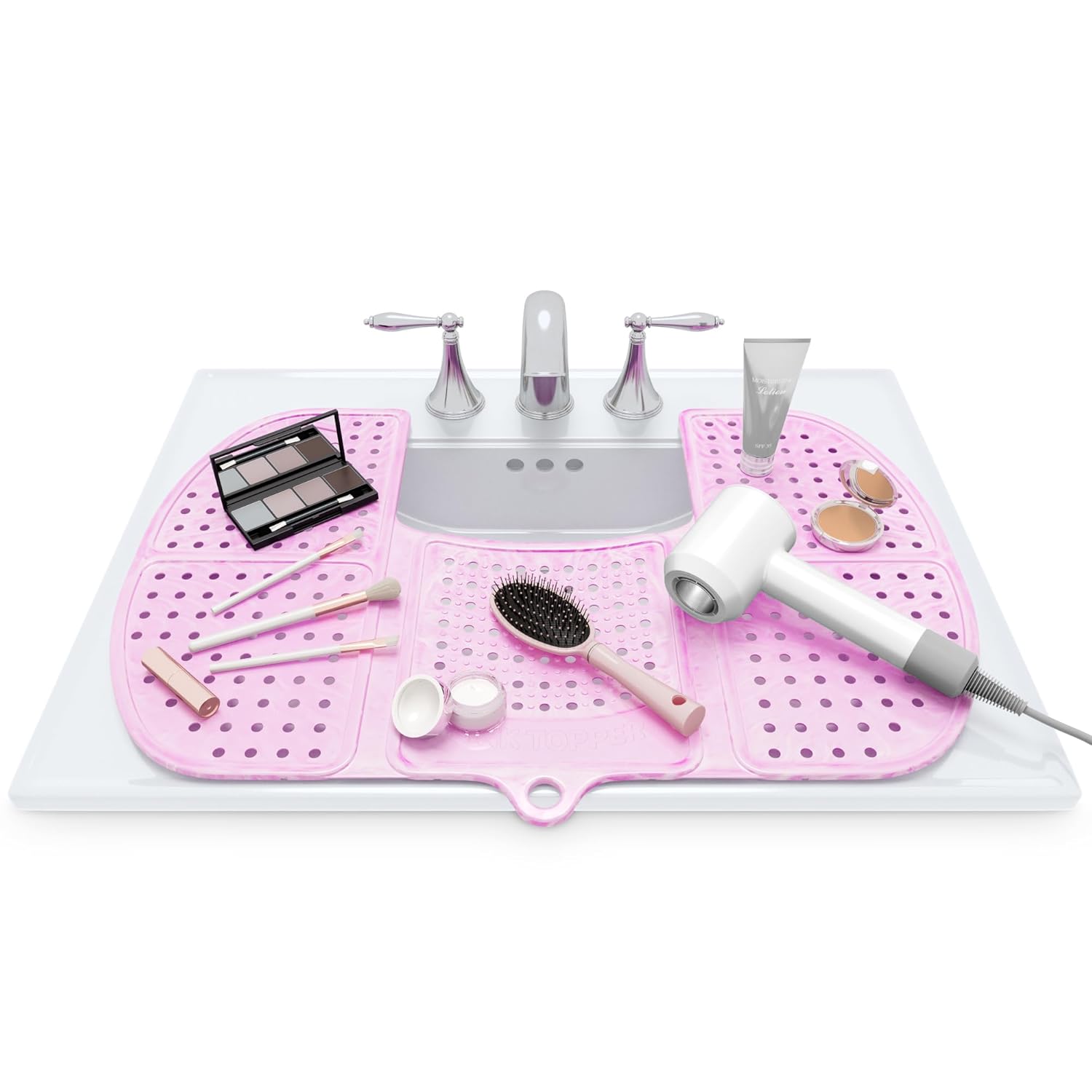 Sink Topper Bathroom Counter Cover & Storage Saver, Foldable Silicone Mat for Hot Tools, Hair Styling & Makeup, Beauty Brush Cleaning Mat, RV Camper Sink Cover & for Small Spaces (Large Pink)