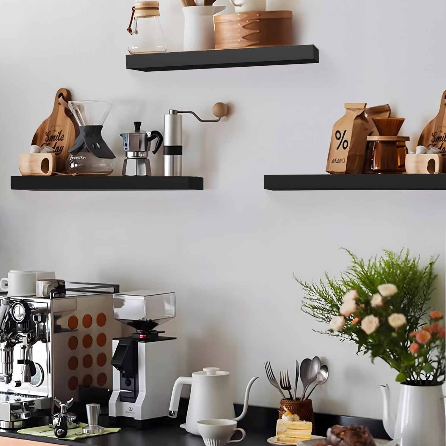 Colima Floating Shelves for Wall Black Wood Wall Shelf for Bedroom, 24 Inch Wall Mounted Floating Shelves for Bathroom Living Room Kitchen Office, 1.3" Thick Floating Book Shelves for Wall, Set of 3
