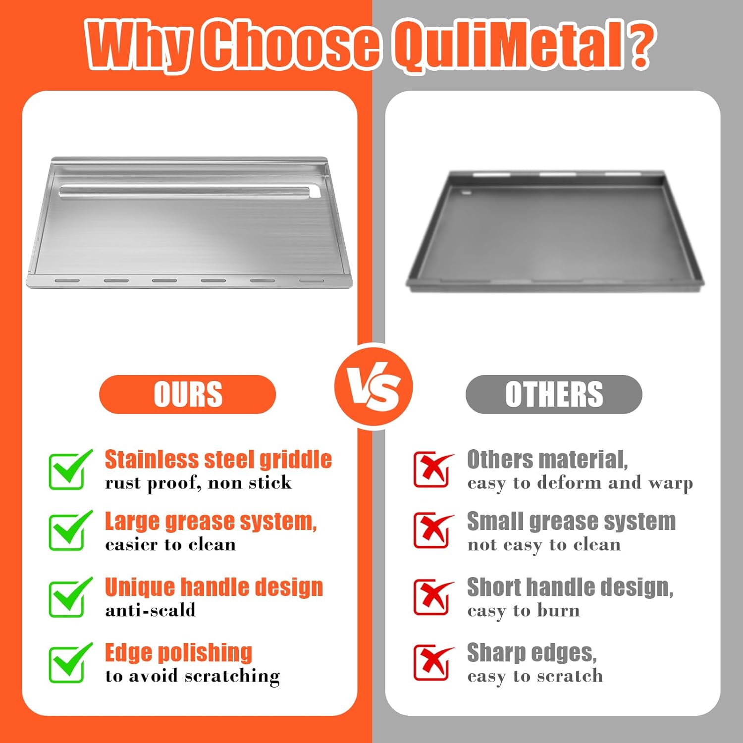 - đ„ăUpgraded Featuresă1. The stainless steel material is built to last, offering excellent heat resistance and wonât easily deform. 2. Unique handle design, Easily place and remove the griddle from your grill with the unique handle for added convenience. 3. The large grease system makes cleaning grease, oil, and food residues effortless, while preventing flare-ups. 4. Side walls helpKeep food on the griddle and prevent spills or splatters for a cleaner cooking experience. 5. Smooth, polished edges to prevent scratching and ensure durability