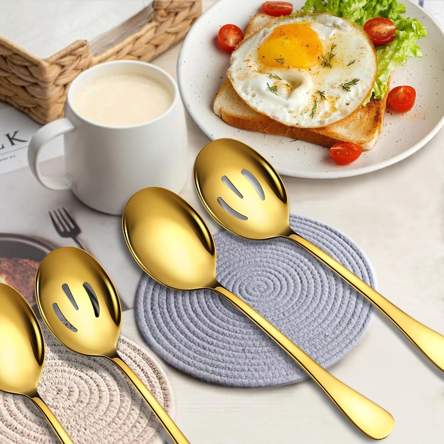 - 【Serving Spoon Set of 8】In this pretty serving spoon set you will get 4 x 10-inch serving spoons, 4x 10-inch slotted spoons.